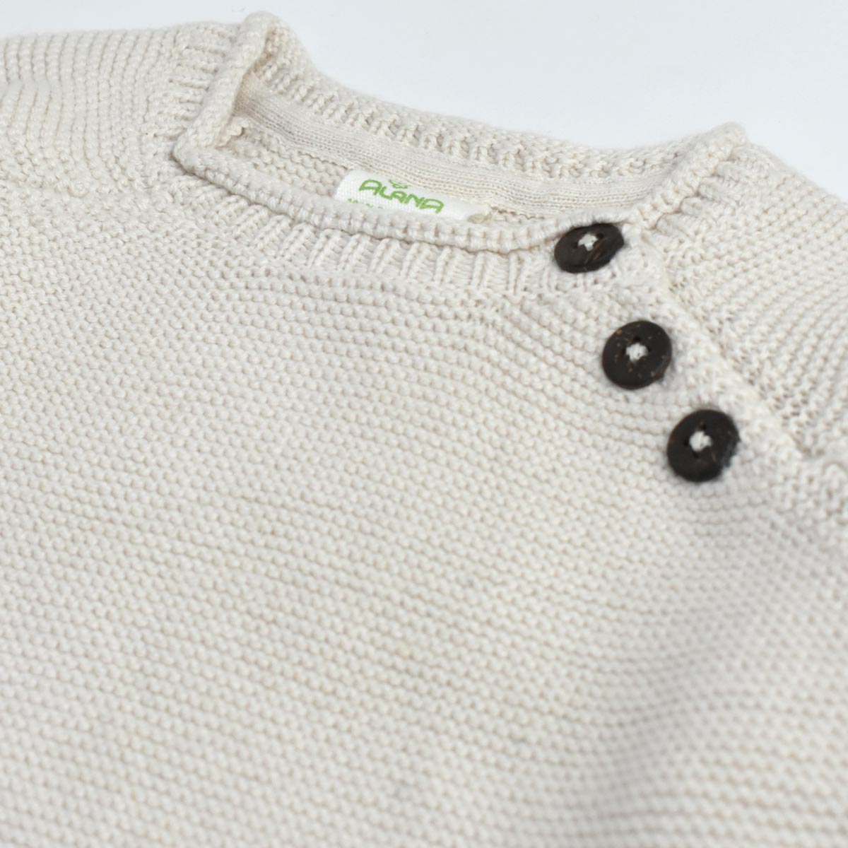 KIDS SWEATER. LONG SLEEVE, ROUND NECK, DECORATIVE BUTTON ON FRONT.