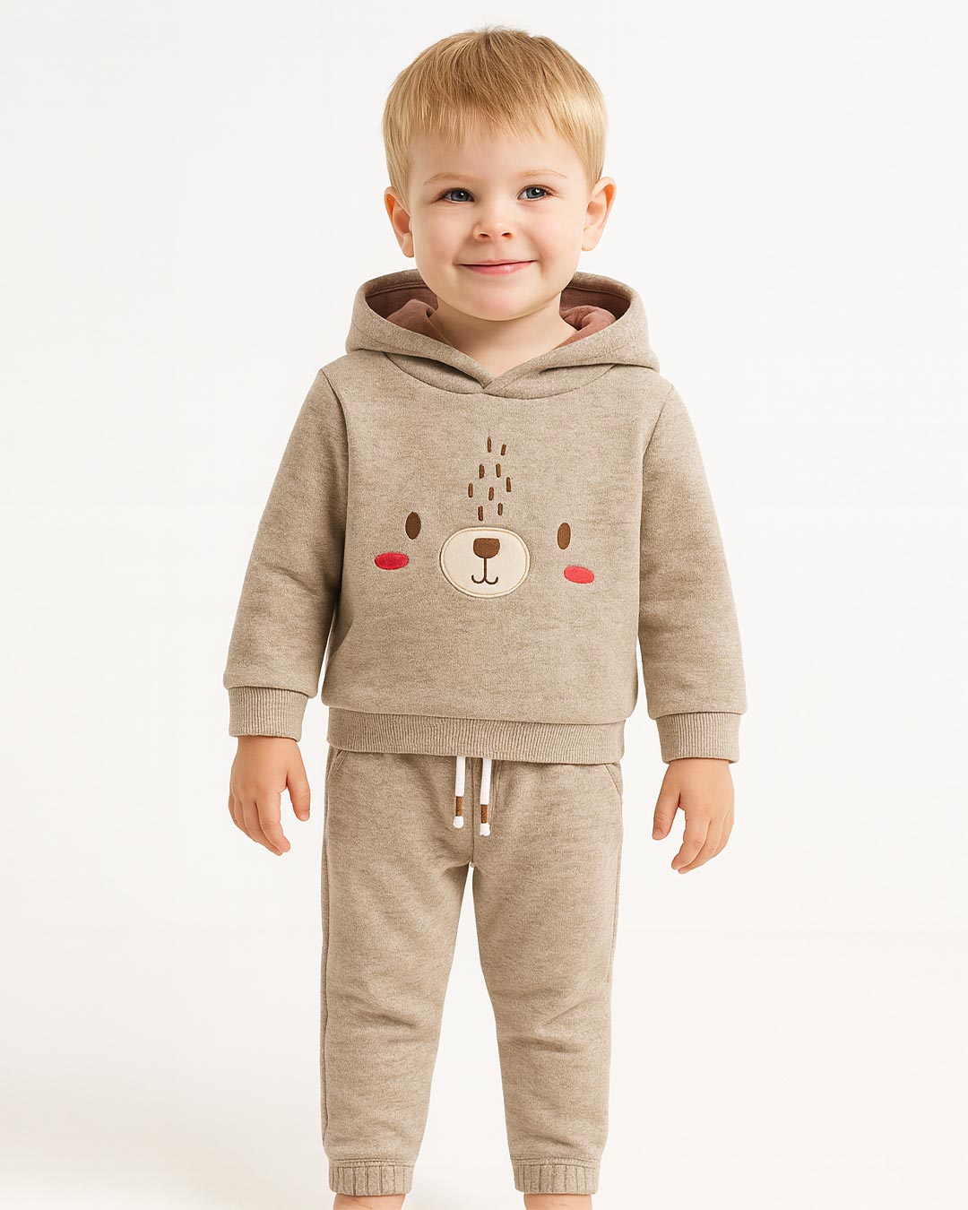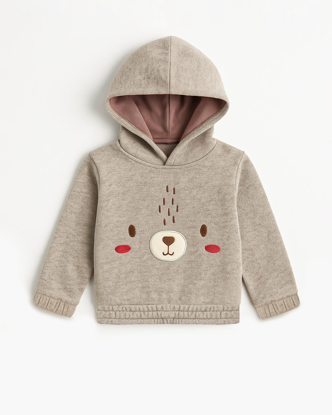 Keep your little one cozy and cute with this Kids Plush Hooded Sweatshirt. Made from ultra-soft plush fabric in a warm beige melange, it features a playful bear face embroidery with adorable details — rosy red cheeks, stitched eyes, and a friendly nose patch. The hood is lined with a contrasting dusty mauve fabric for added style and comfort.