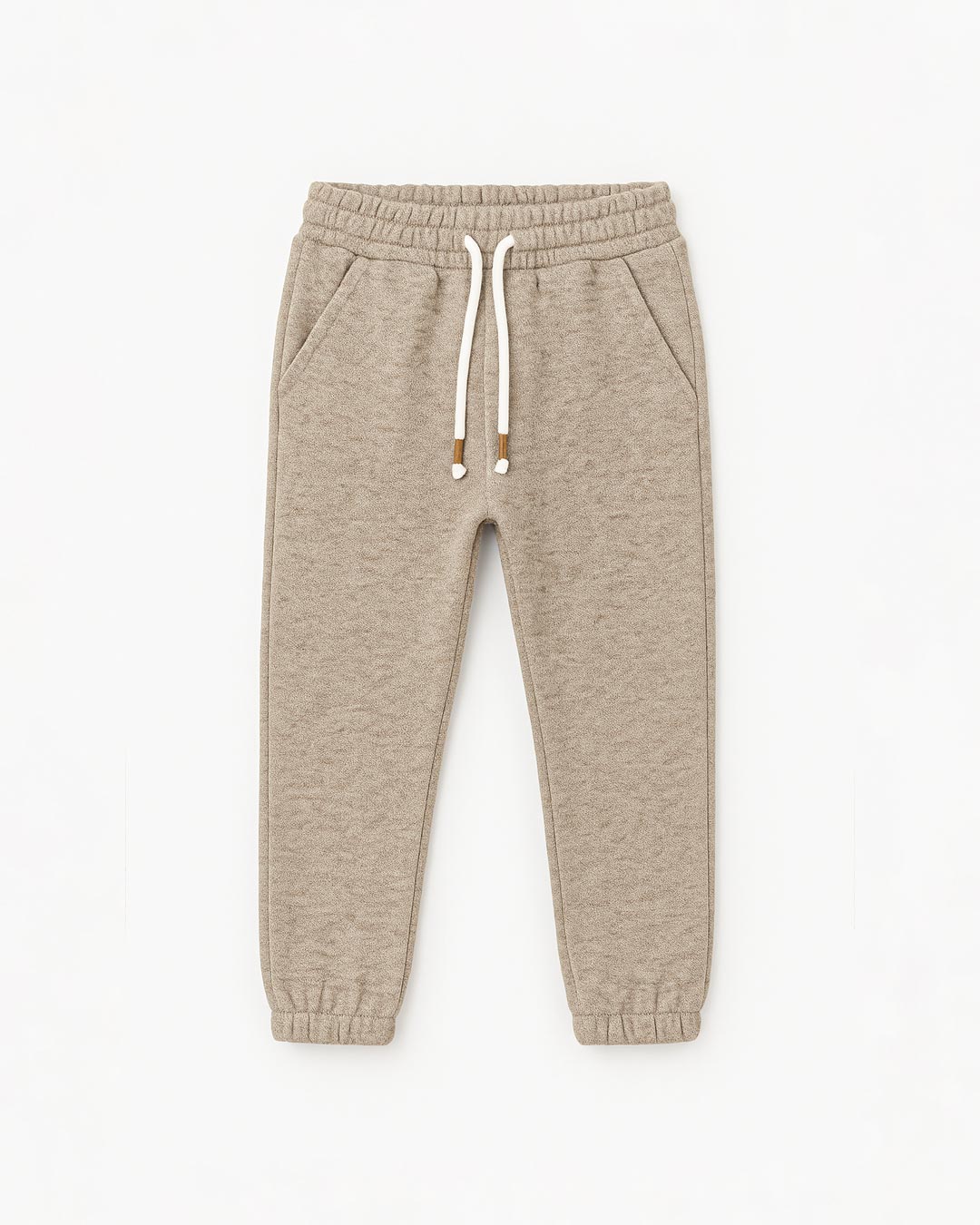 Plush Jogger Trousers. Crafted from soft plush cotton-blend fabric in a neutral beige melange, these joggers feature a comfortable elastic waistband with adjustable white drawstrings, complete with brown tip detailing.