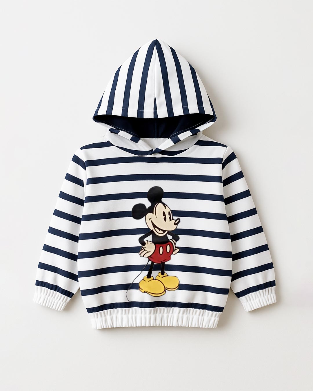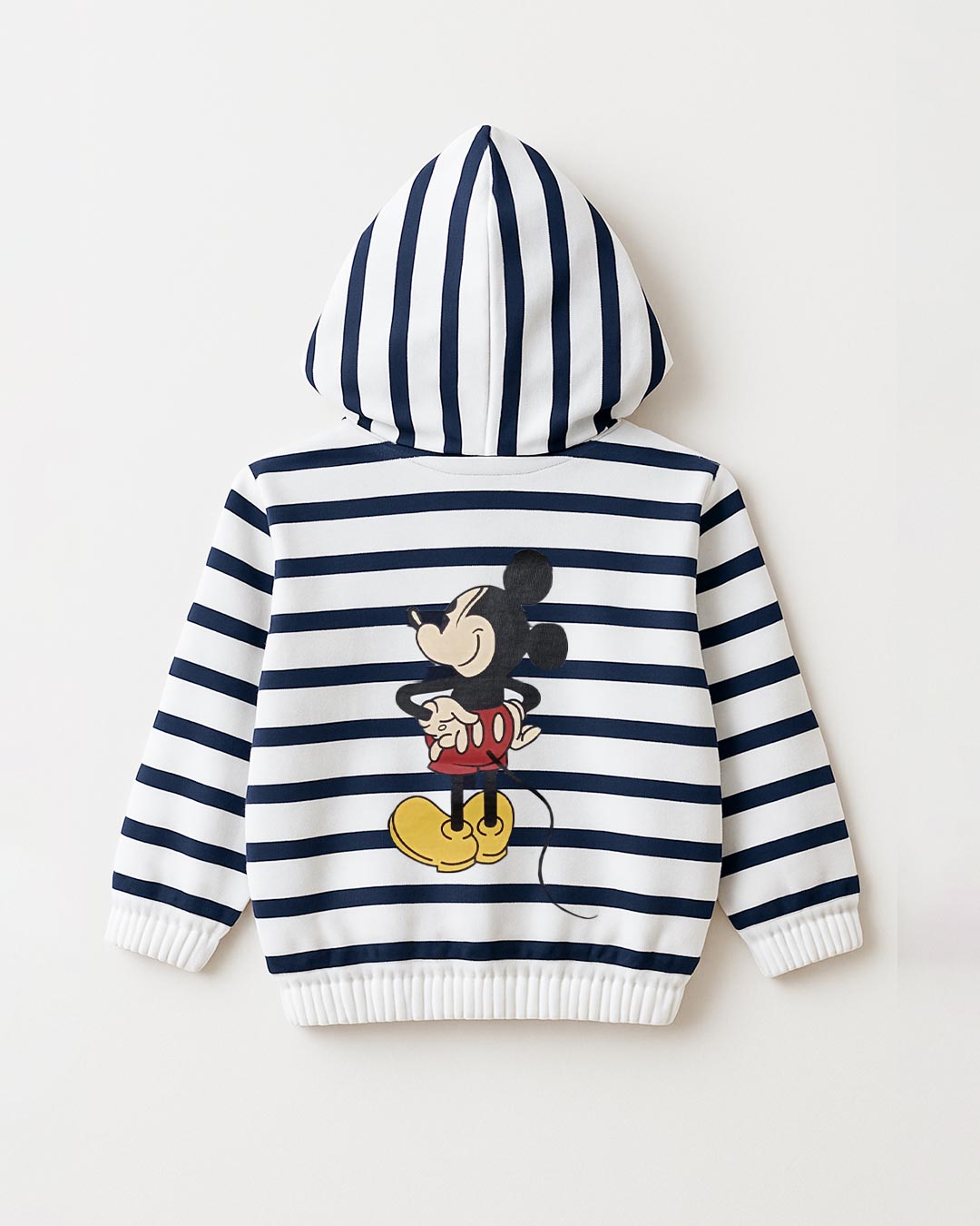 Give your little one the perfect blend of comfort and cuteness with this Boys Striped Mickey Hoodie & Jogger Set. The cozy navy-and-white striped hoodie features a fun Mickey print on the front, adding a playful touch kids love. Paired with soft red jogger trousers, this set offers a warm, comfy fit ideal for everyday wear, outings, or casual playtime.