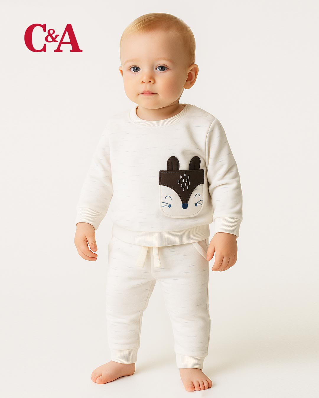 Dress your little one in cozy comfort and adorable style with this plush two-piece set by C&A. Made from ultra-soft fleece fabric, the sweatshirt features a charming fox face appliqué with 3D ear accents, while the speckled jogger pants are designed with a stretchy waistband and ribbed cuffs for a perfect fit. The soothing natural white color with subtle texture gives it a clean, modern look—ideal for indoor lounging or everyday play.