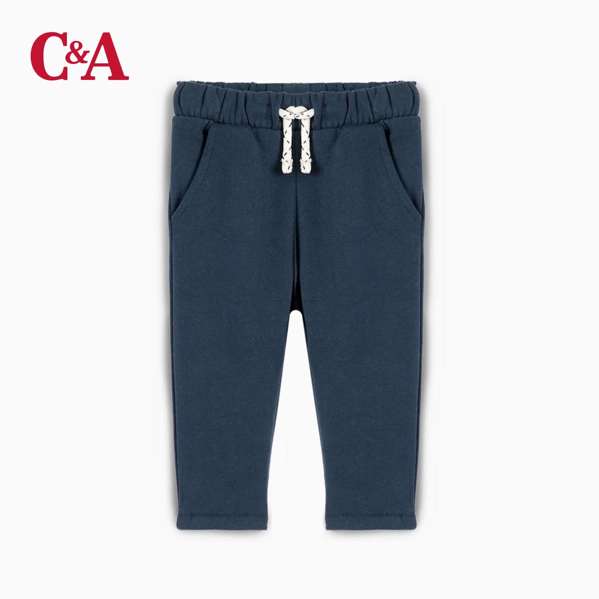 Baby joggers in soft fabric. Elasticated waistband with mock drawstring and side slash pockets.