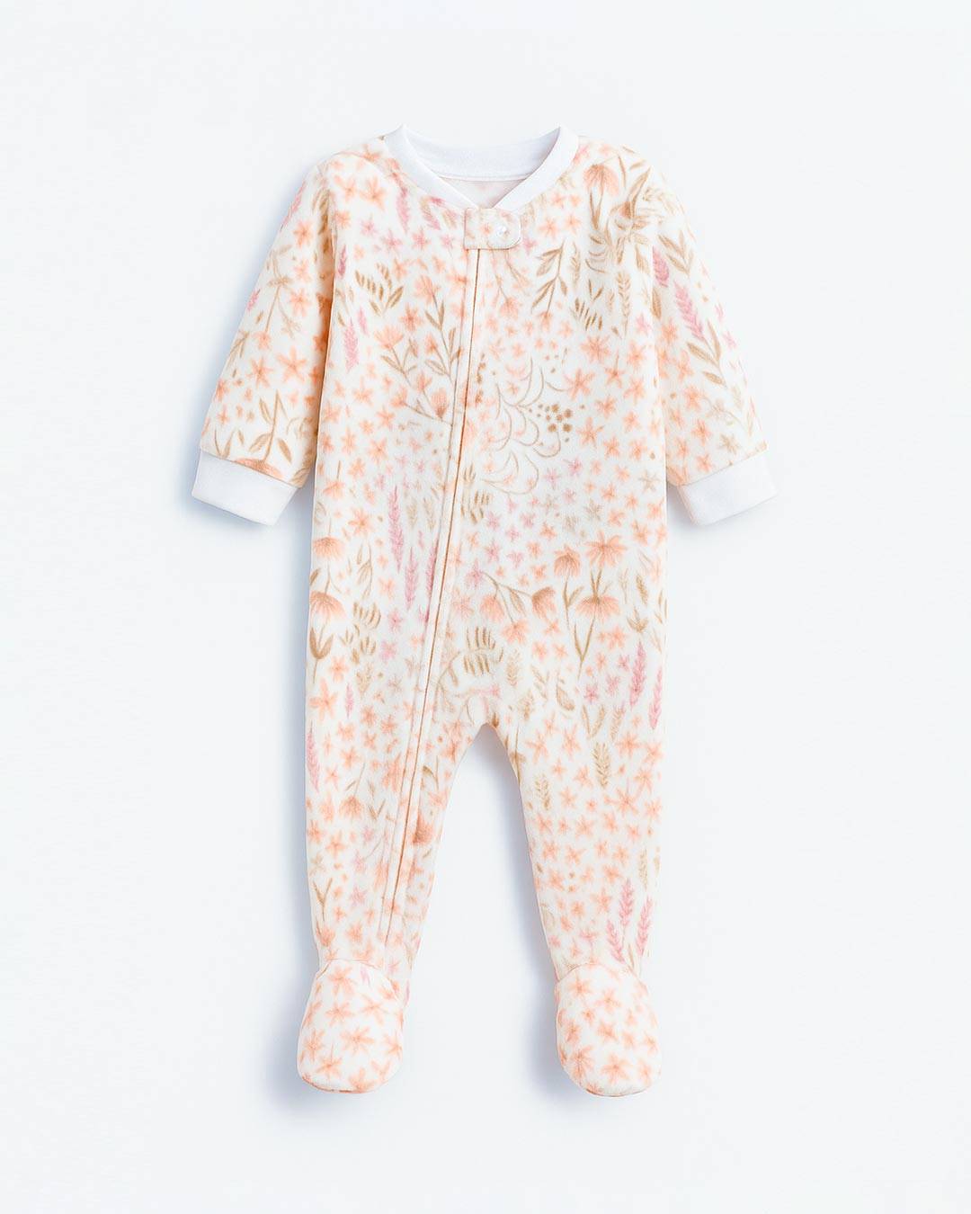 Wrap your little one in cozy comfort with this soft fleece full-body romper. Featuring a charming all-over floral print in warm hues of pink, peach, and taupe, this adorable sleeper is as stylish as it is practical. Crafted from premium light fleece, it offers excellent warmth while remaining breathable and gentle against delicate baby skin.