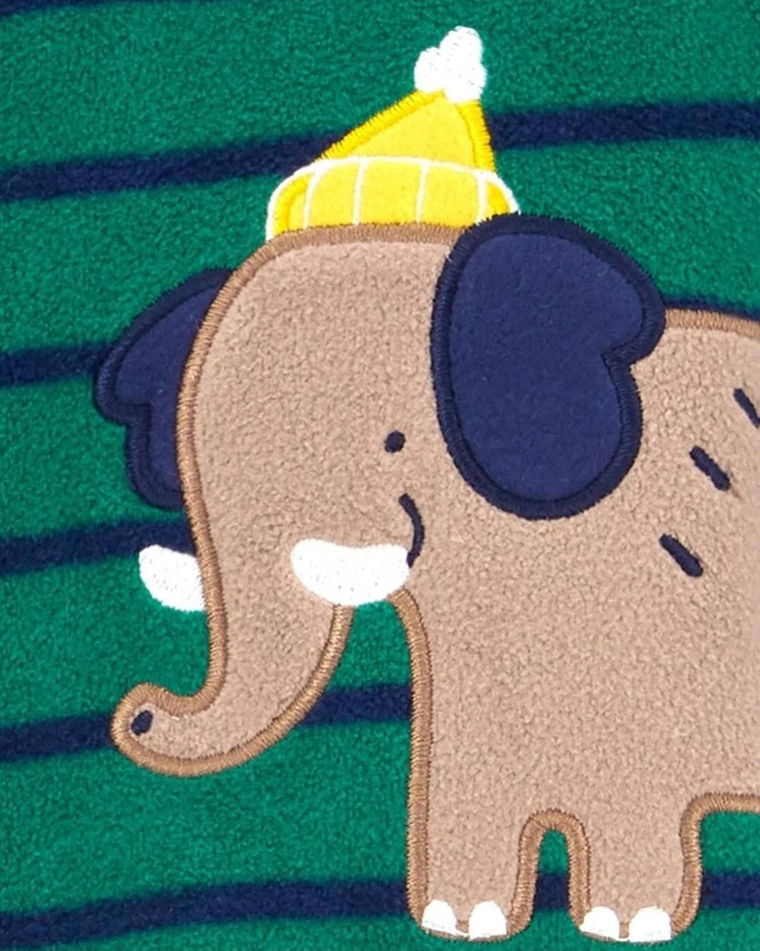 Bring comfort and cuteness together with this cozy Carter’s Green Striped Fleece Romper, designed with cheerful vibes and play-ready functionality. Crafted from ultra-soft fleece, this full-length romper features bold green and navy stripes and an adorable elephant appliqué wearing a yellow winter cap—perfect for a playful bedtime look.