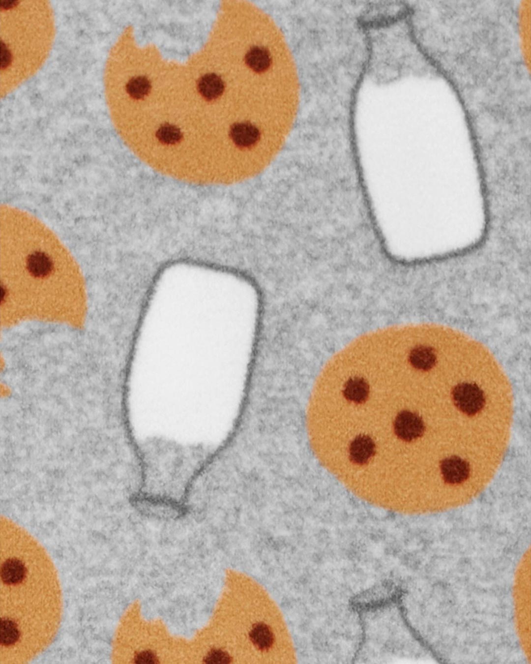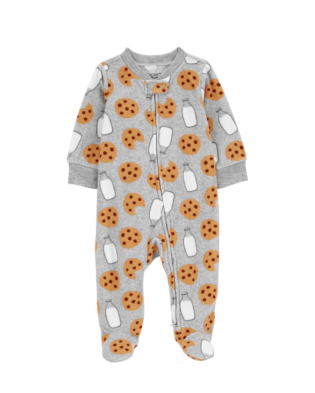 Features: Heather Grey with allover milk and cookies print, snap fastening tab at crew neck, long sleeves with rib-knit cuffs, 2-way zipper, footed ends