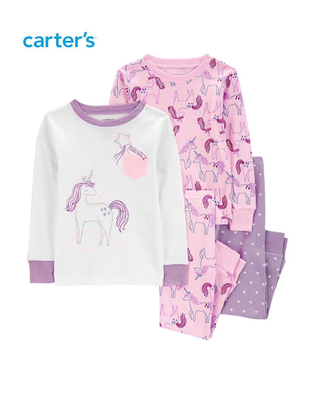 Details & Sizing About This Item Crafted in soft cotton, this PJ set has your little one ready for bed in no time. Carter's cotton PJs are not flame resistant. But don't worry! They're designed with a snug and stretchy fit for safety and comfort. Style # V_2R493210 Features: 4-piece set Long sleeves Ribbed cuffs and neckline Covered elastic waistband for a comfy fit Fabric & Care: Cotton pjs are not flame resistant. To help keep children safe, cotton pjs should always fit snugly. 100% cotton rib Imported Machine washable STANDARD 100 by OEKO-TEX®20.HUS.39362