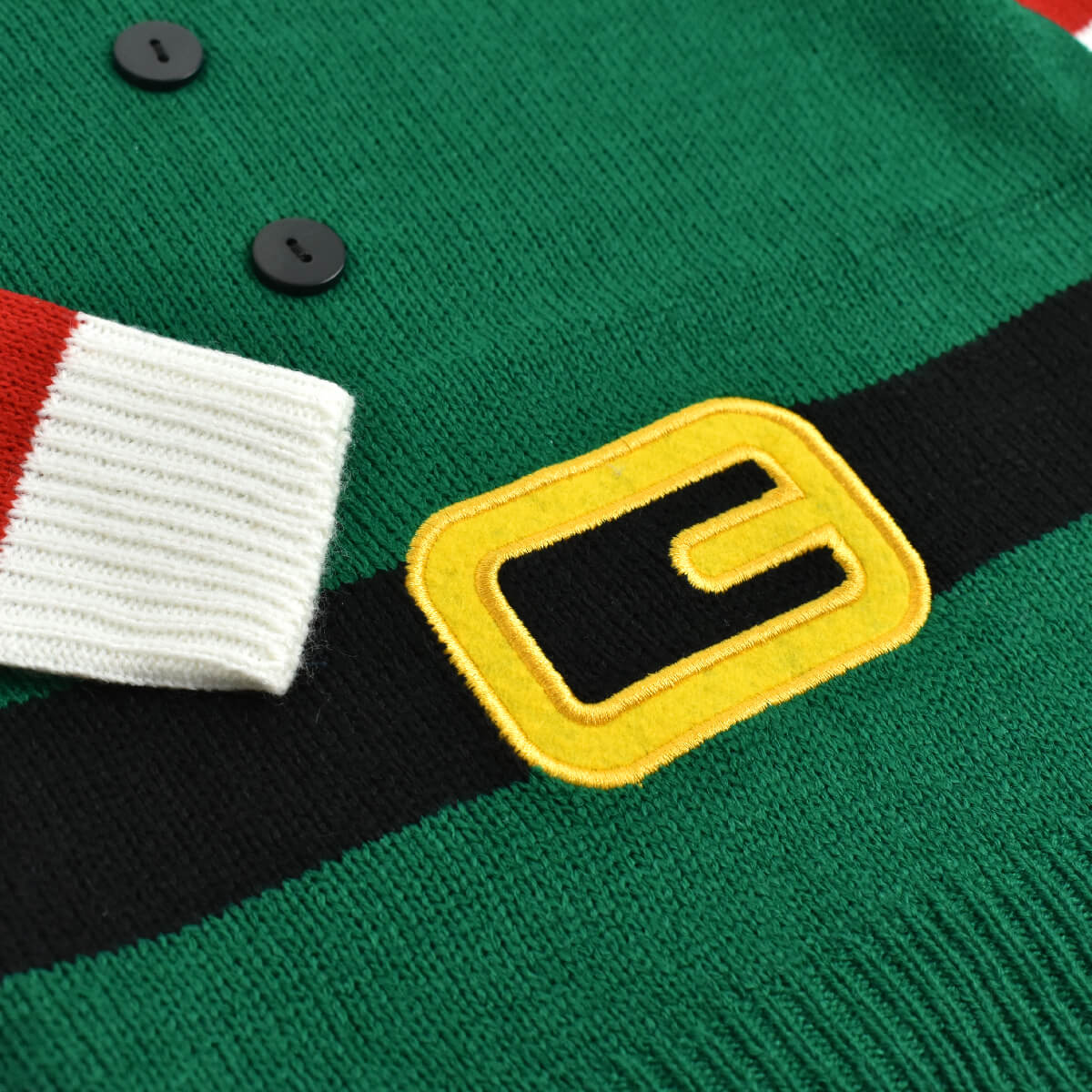 THIS WARM SWEATER HAS COLORFUL DESIGN. 3 DECORATIVE BUTTONS ON FRONT. CREW NECK. RIBSLEEVES AND HEM.