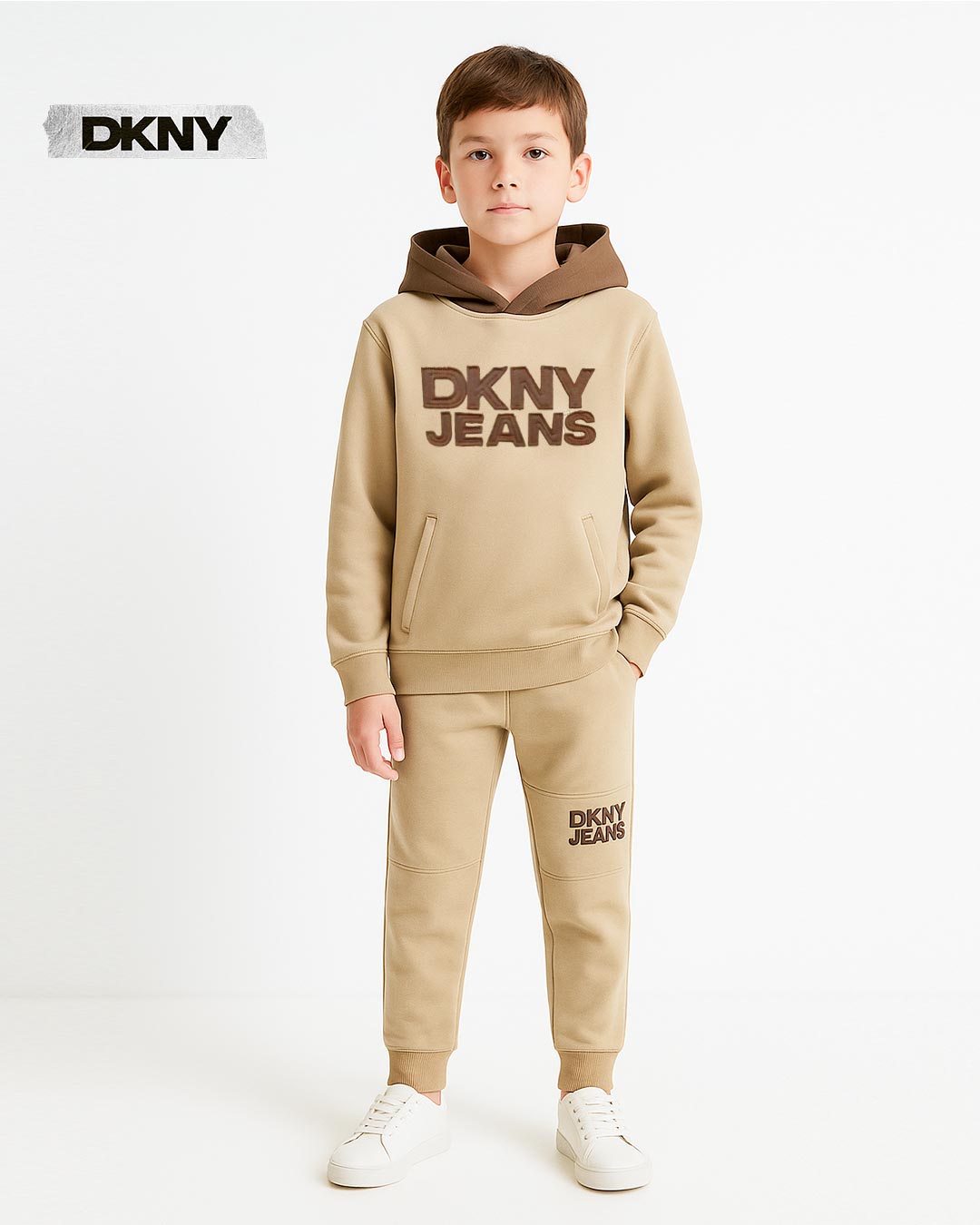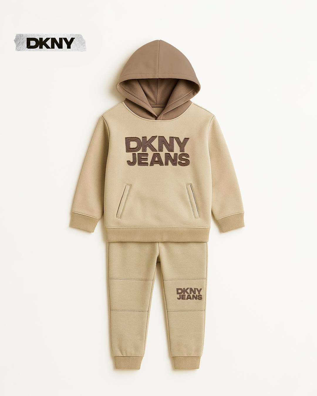 Give your little one a street-smart edge with this DKNY Jeans coordinated hoodie and jogger set. Crafted in a soft camel-toned fleece fabric, this two-piece outfit combines effortless style with cozy comfort.