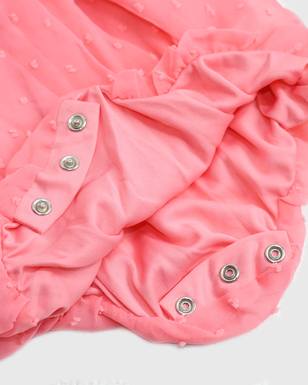 This is a sweet 100% polyester bubble romper . It is pink salmony color . It has a double ruffle at the neckline with a fabric rose . Very pretty...