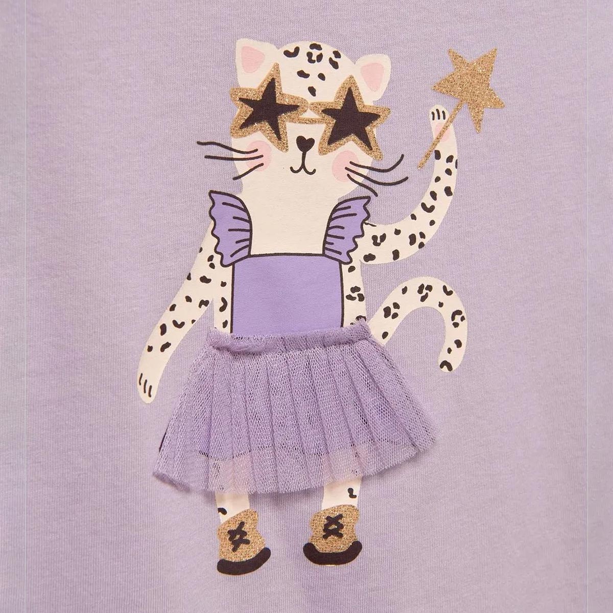 About the product Purple T-shirt for girls Futurino with a print decorated with sparkles and voluminous elements. 100% cotton Short sleeve Please note that the correct determination of the size of children's clothing directly depends on the individual characteristics of the child.