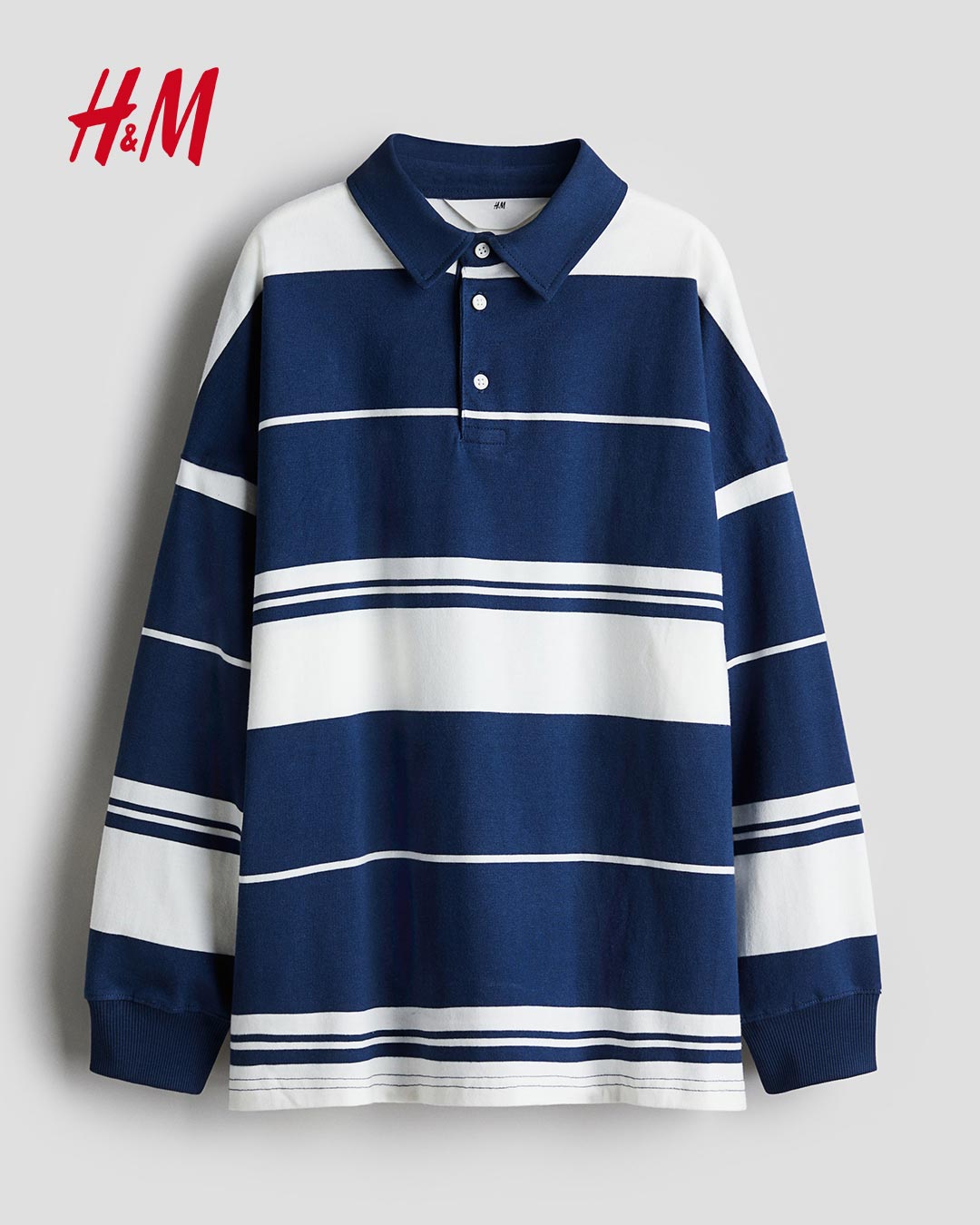 Rugby shirt in sturdy cotton jersey with a collar, button placket, dropped shoulders and long sleeves with ribbed cuffs. Short slit at each side of the hem.