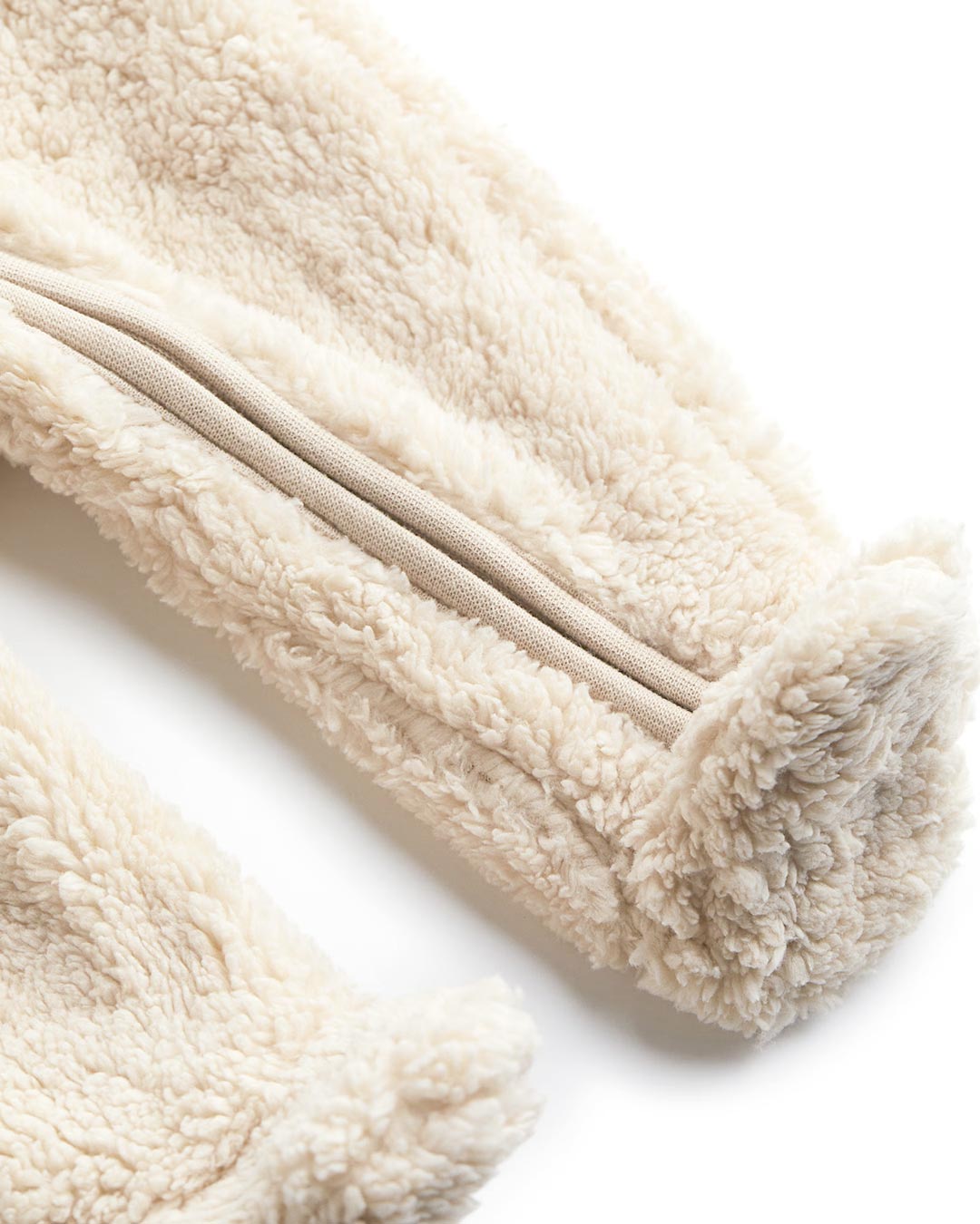 All-in-one suit in soft pile. Hood with ears and a zip down the front that has a chin guard at the top and continues down one leg. Opening mitts at the cuffs that can be folded over to keep the hands warm. Jersey lining.
