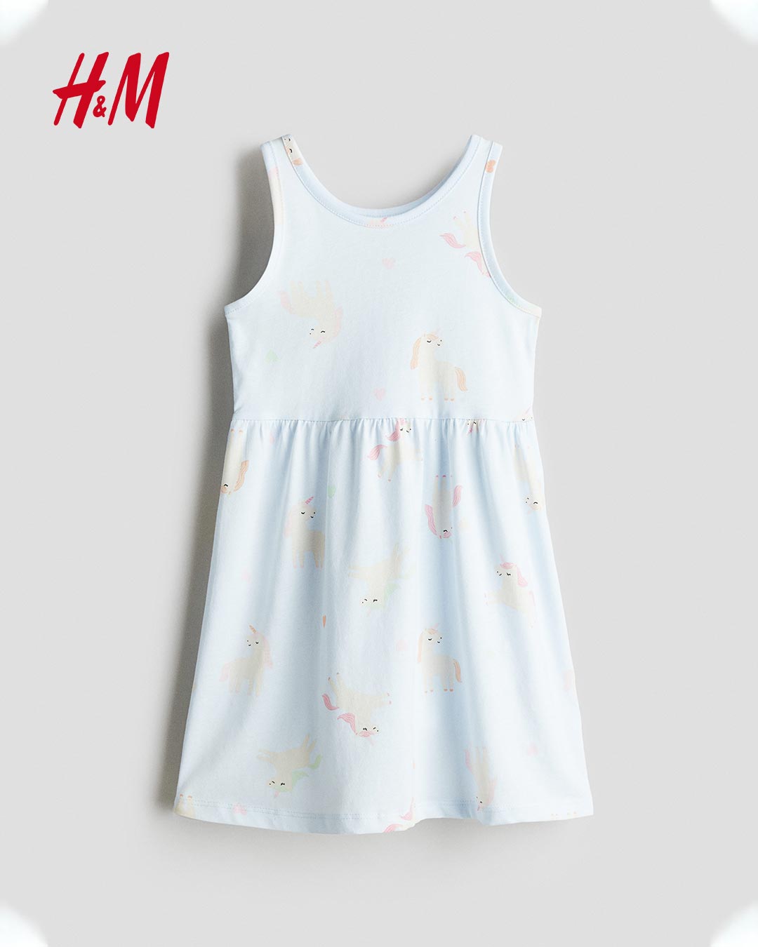 Sleeveless dress in patterned cotton jersey with a gathered seam at the waist and a flared skirt.