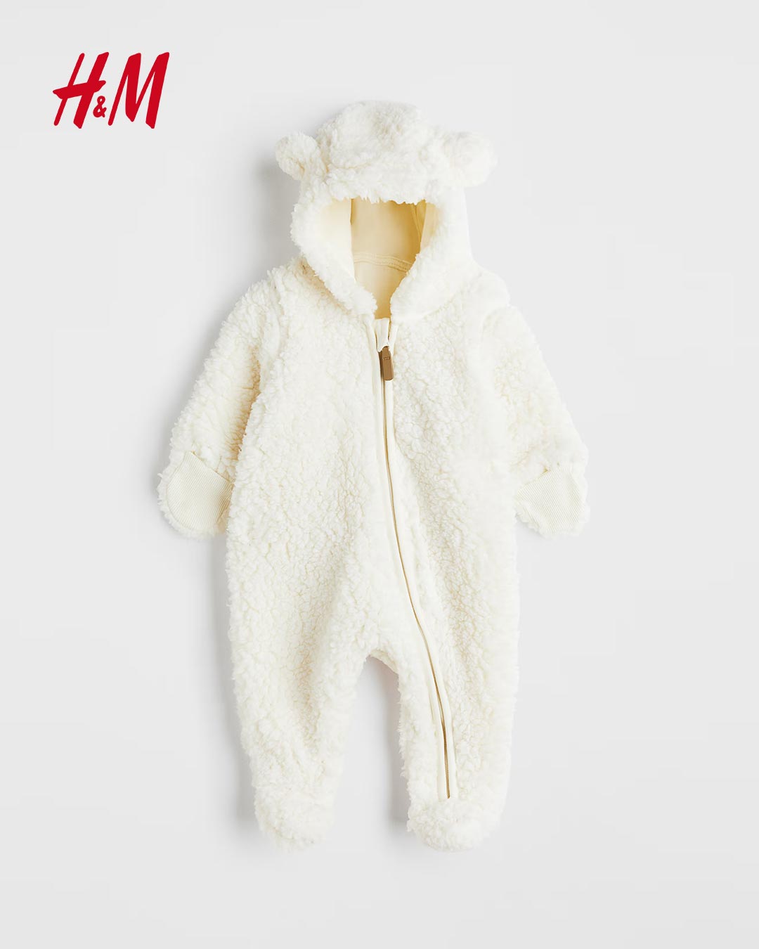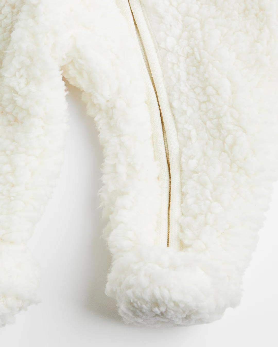 All-in-one suit in soft pile. Hood with ears and a zip down the front that has a chin guard at the top and continues down one leg. Opening mitts at the cuffs that can be folded over to keep the hands warm. Jersey lining.