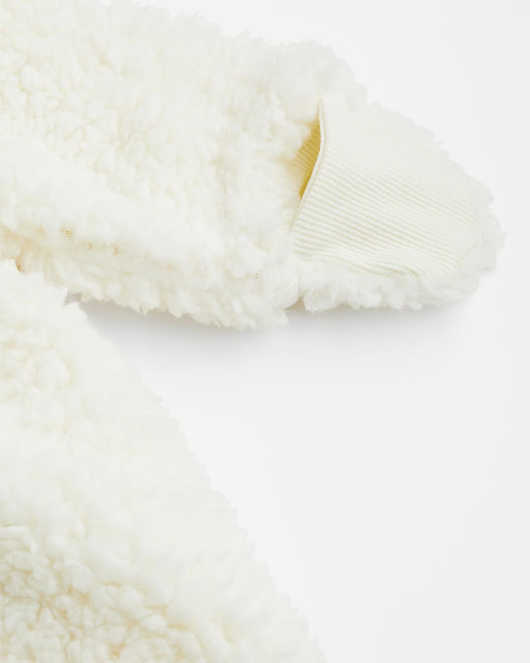 All-in-one suit in soft pile. Hood with ears and a zip down the front that has a chin guard at the top and continues down one leg. Opening mitts at the cuffs that can be folded over to keep the hands warm. Jersey lining.