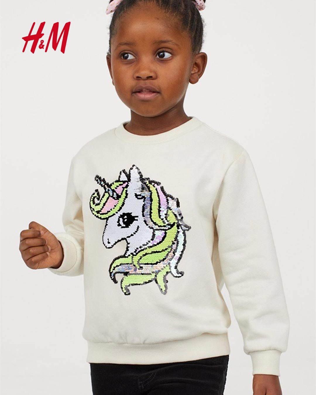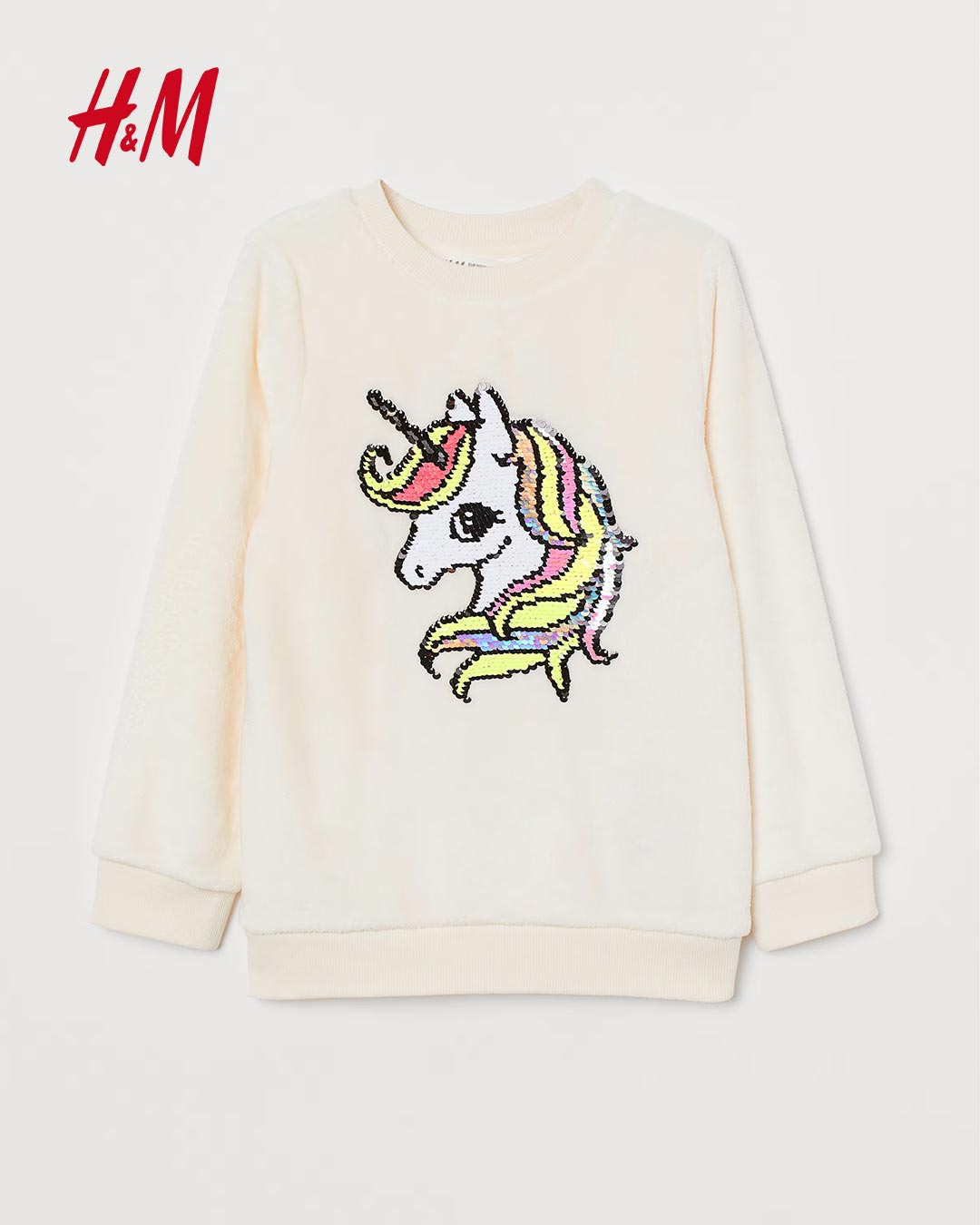 Long-sleeved blouse made of soft, fluffy velvet fabric with a double-sided sequin design on the front (in size 98 with regular sequins). Ribbed neckline, cuffs and hem.