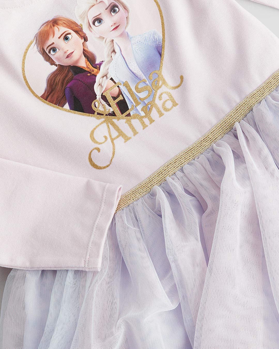 Dress in soft jersey with a print on the front. Features long puff sleeves, a round neckline and a low cut back. Glittery elastication at the waist and a lined skirt in multiple layers of tulle for a puffy silhouette.