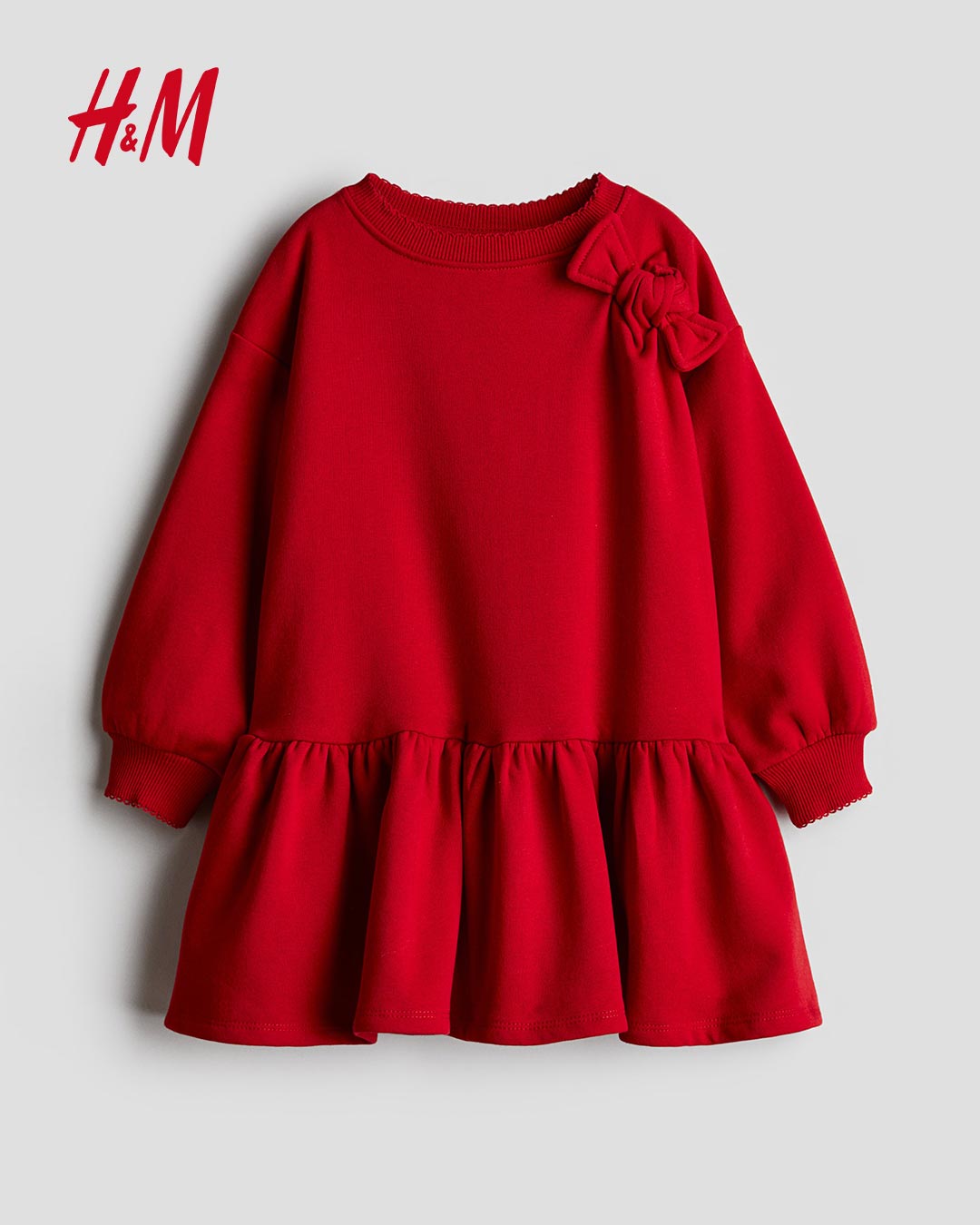 Dress in sweatshirt fabric with a soft, brushed inside. Round, ribbed neckline, long sleeves, and ribbed cuffs. Gently flared skirt with a gathered seam above hem.