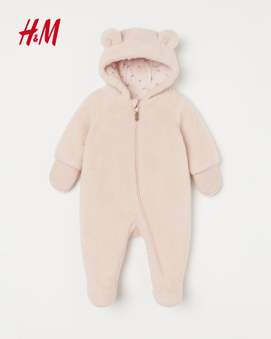 All-in-one suit in soft pile. Hood with ears and a zip down the front that has a chin guard at the top and continues down one leg. Opening mitts at the cuffs that can be folded over to keep the hands warm. Jersey lining.
