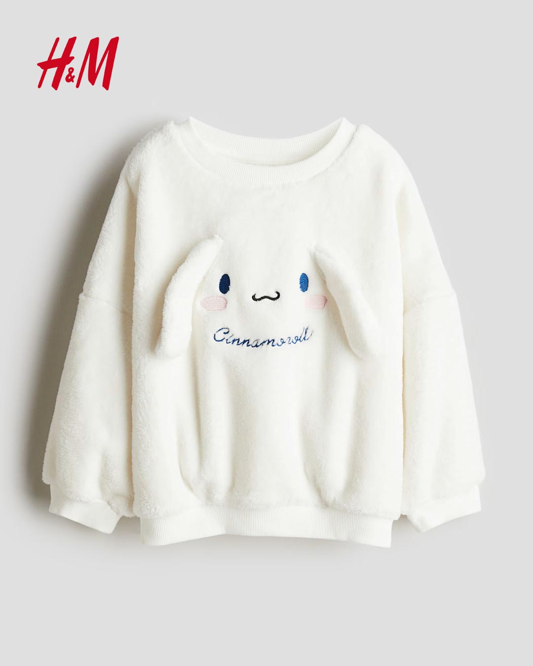 Soft pile sweatshirt with embroidery and appliqués on the front. Round neck with ribbed trim. Dropped shoulders with low shoulder line. Ribbed cuffs and hem.