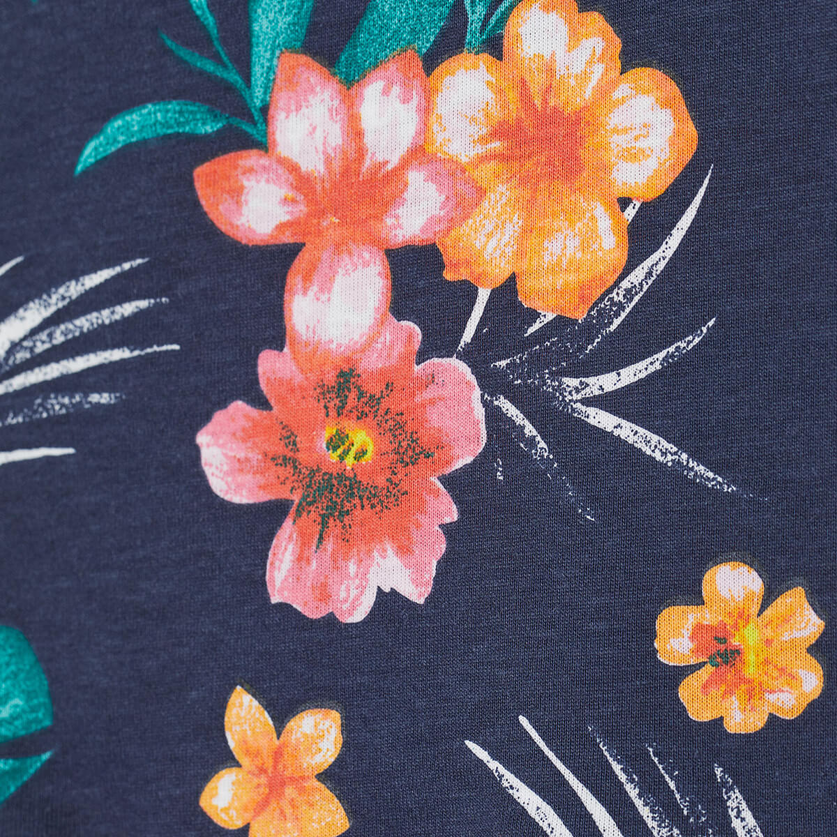 Sleeveless dress in cotton jersey with a printed design. Gathered seam at waist and flared skirt.