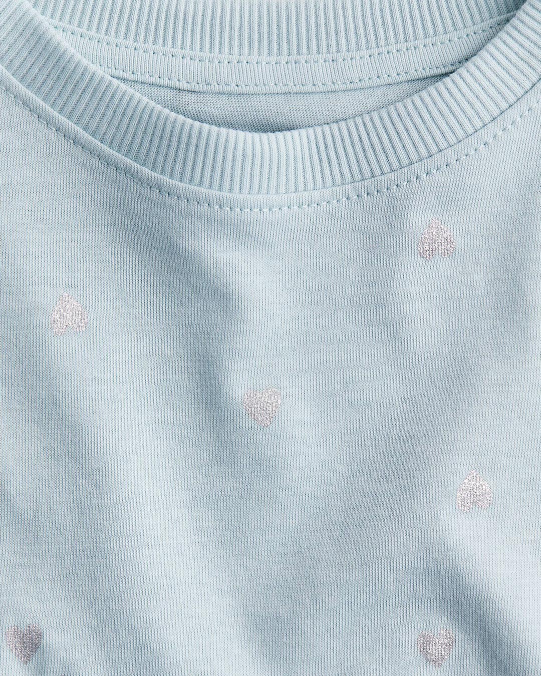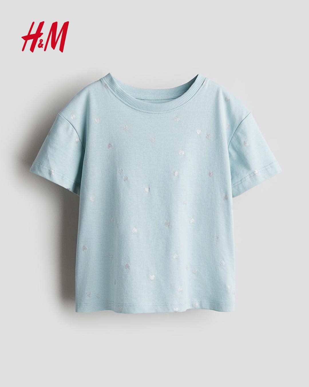 Description & fit Short-sleeved top in soft, printed cotton jersey with a narrow trim around the neckline. Length: Regular length Sleeve Length: Short sleeve Fit: Regular fit Neckline: Round neck Description: Light blue/Silver-coloured, Patterned, Hearts
