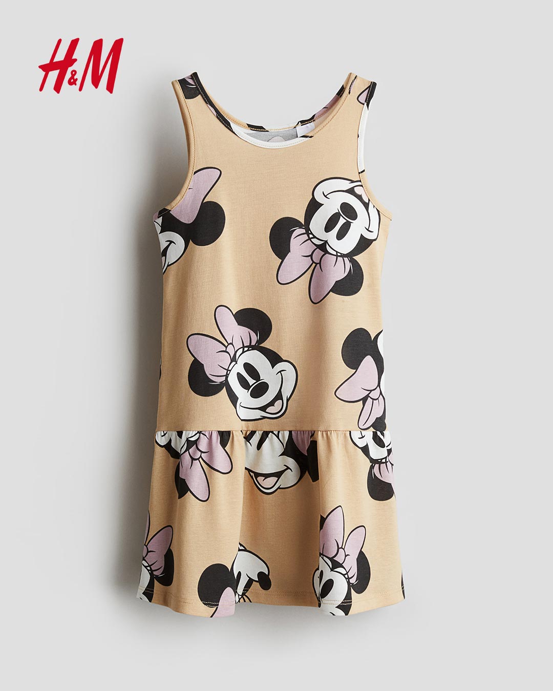 Description Comfortable sleeveless dress in soft, patterned cotton jersey with a gathered seam at the waist and gently flared skirt.