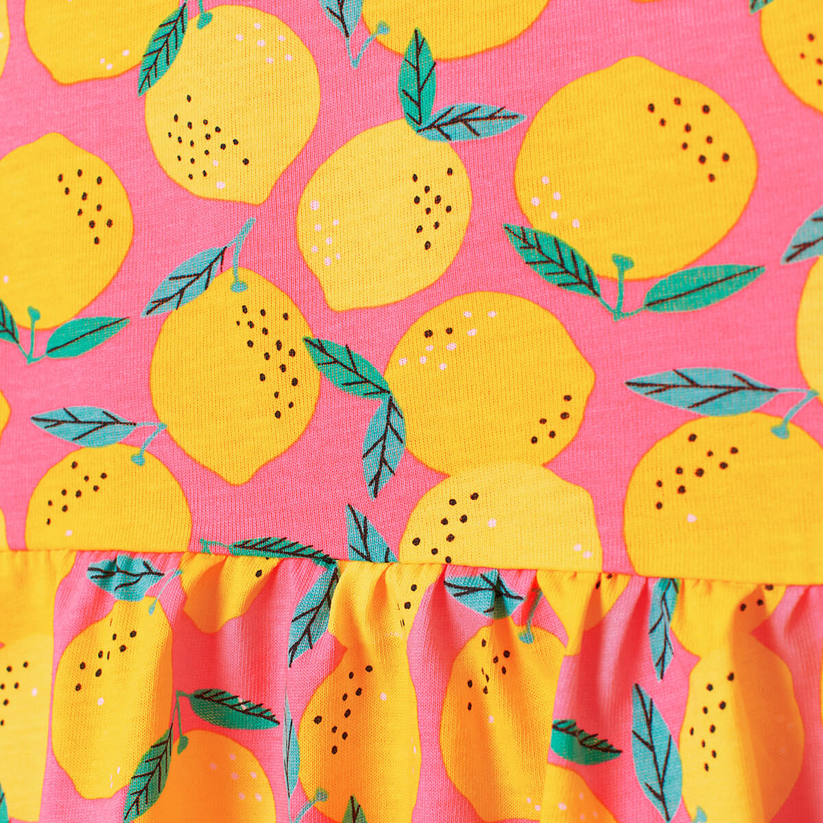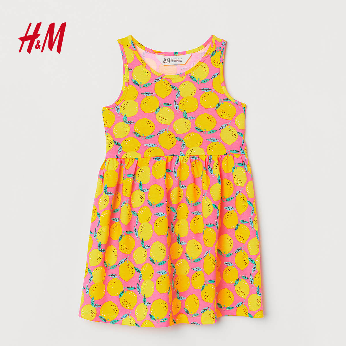 Sleeveless dress in printed cotton jersey with a gathered seam at the waist and flared skirt.