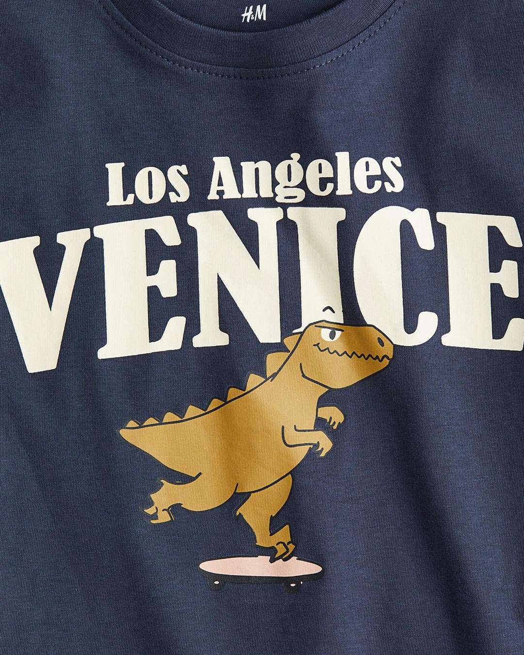 Description & fit New Arrival Classic T-shirt in soft jersey with a printed design. Round, ribbed neck and a straight-cut hem. Art. No.: 1216652087 Length: Regular length Sleeve Length: Short sleeve Fit: Regular fit Neckline: Round Neck Description: Navy blue/khaki green/white, Los Angeles Venice, Dinosaur