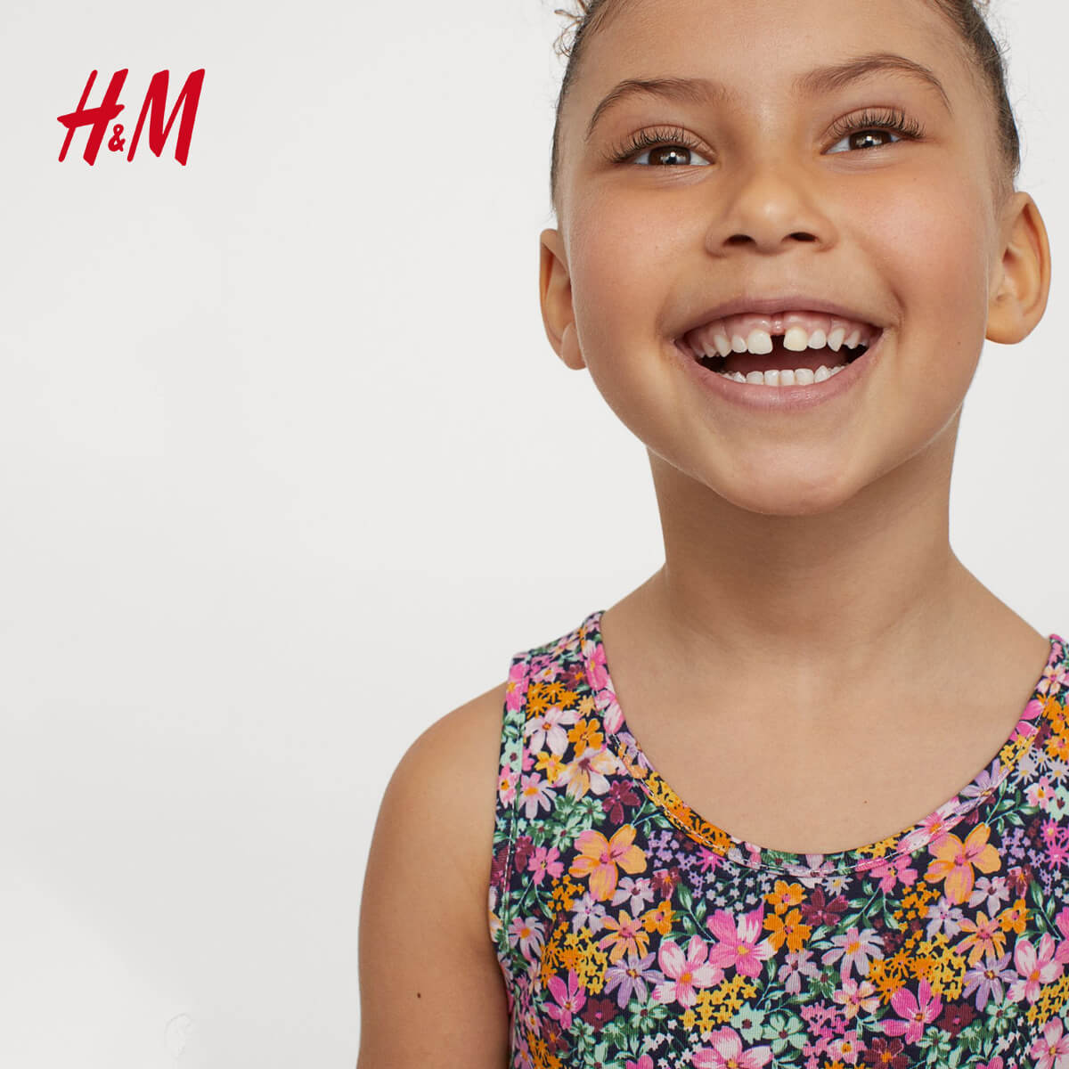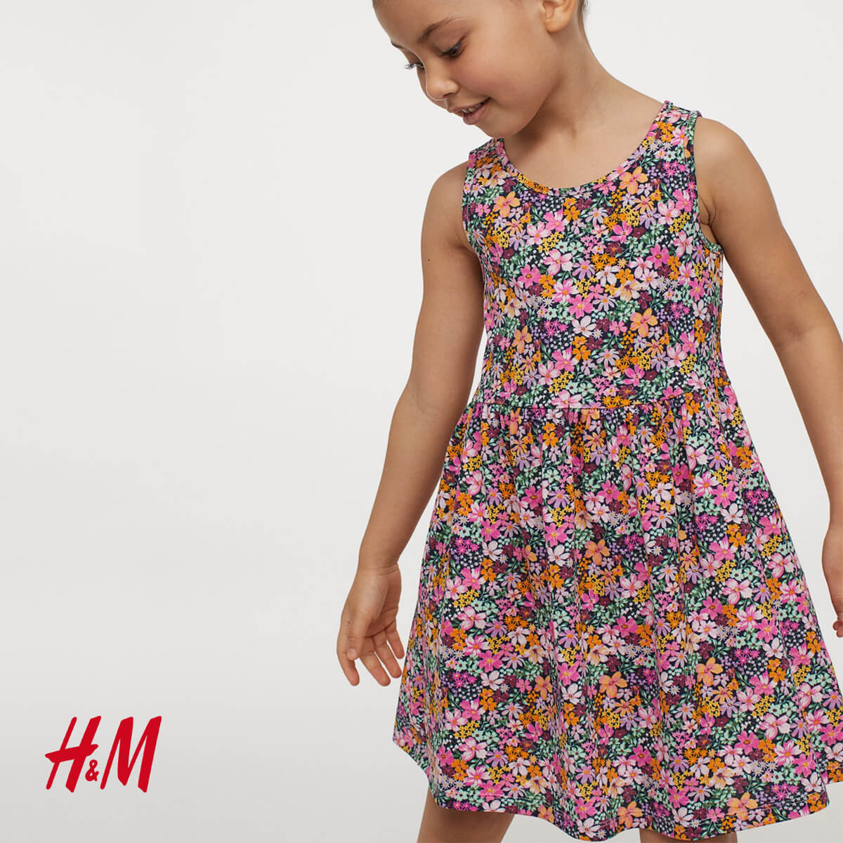Sleeveless dress in patterned cotton jersey with a gathered seam at the waist and flared skirt.