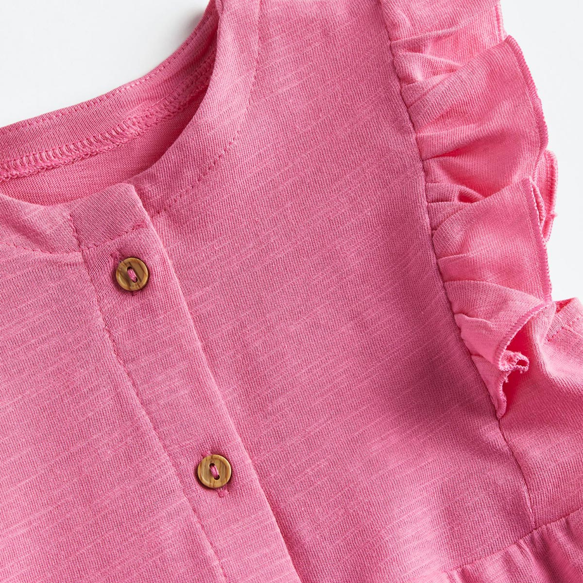 Sleeveless romper suit in soft cotton jersey with a flounced trim over the shoulders, a gathered seam at the top and buttons down the front. Art. No.:1129307001