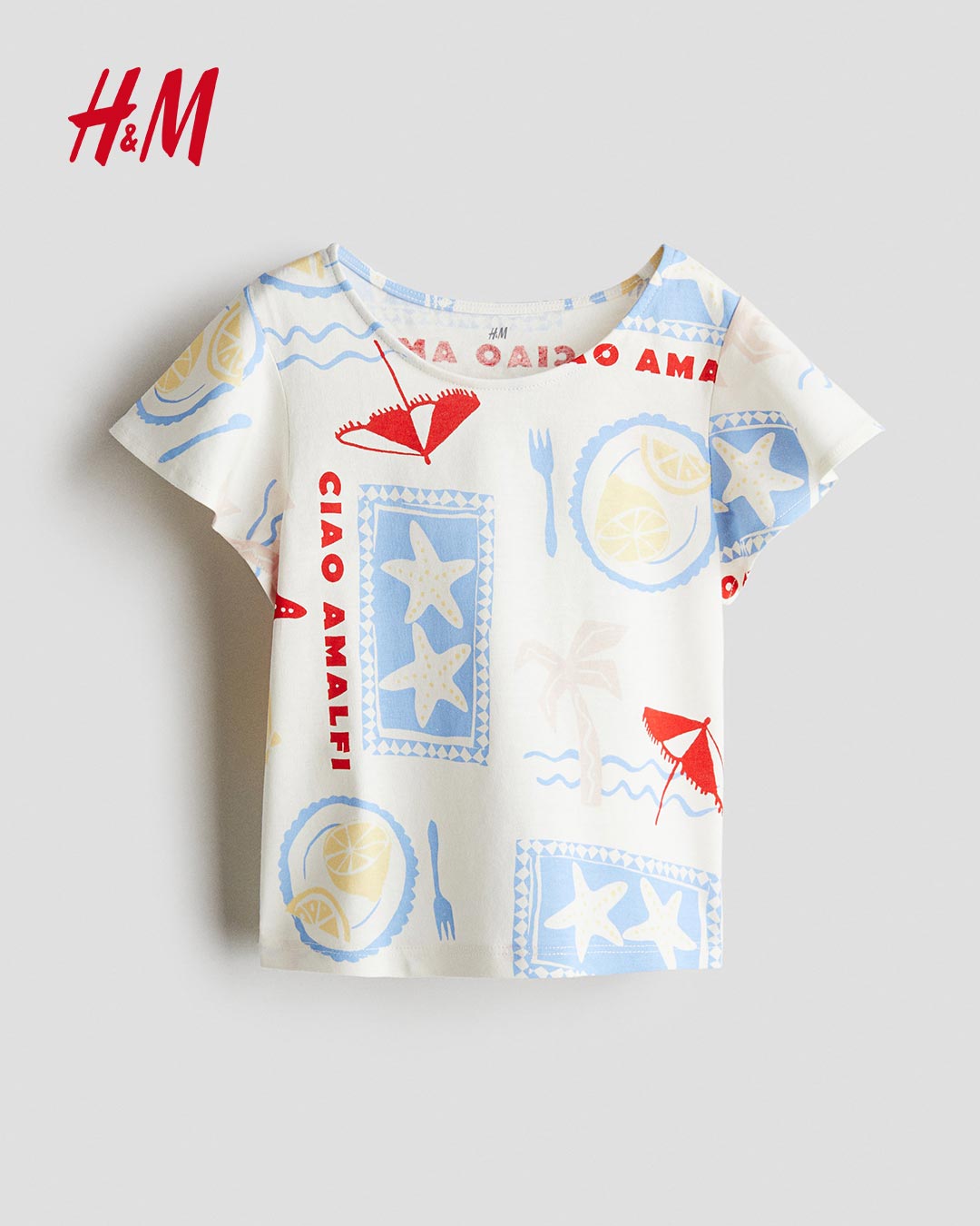 Description Top in cotton jersey with a printed design. Round neckline and flutter sleeves. Art. No.: 1290744001 Length: Regular length Fit: Regular fit Neckline: Round Neck Description: White/light blue/red/light yellow, Ciao Amalfi, Parasols, beach towels, starfish, lemons