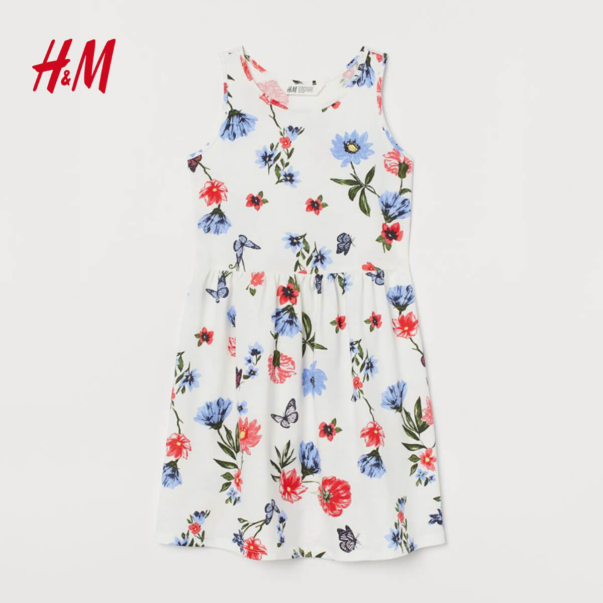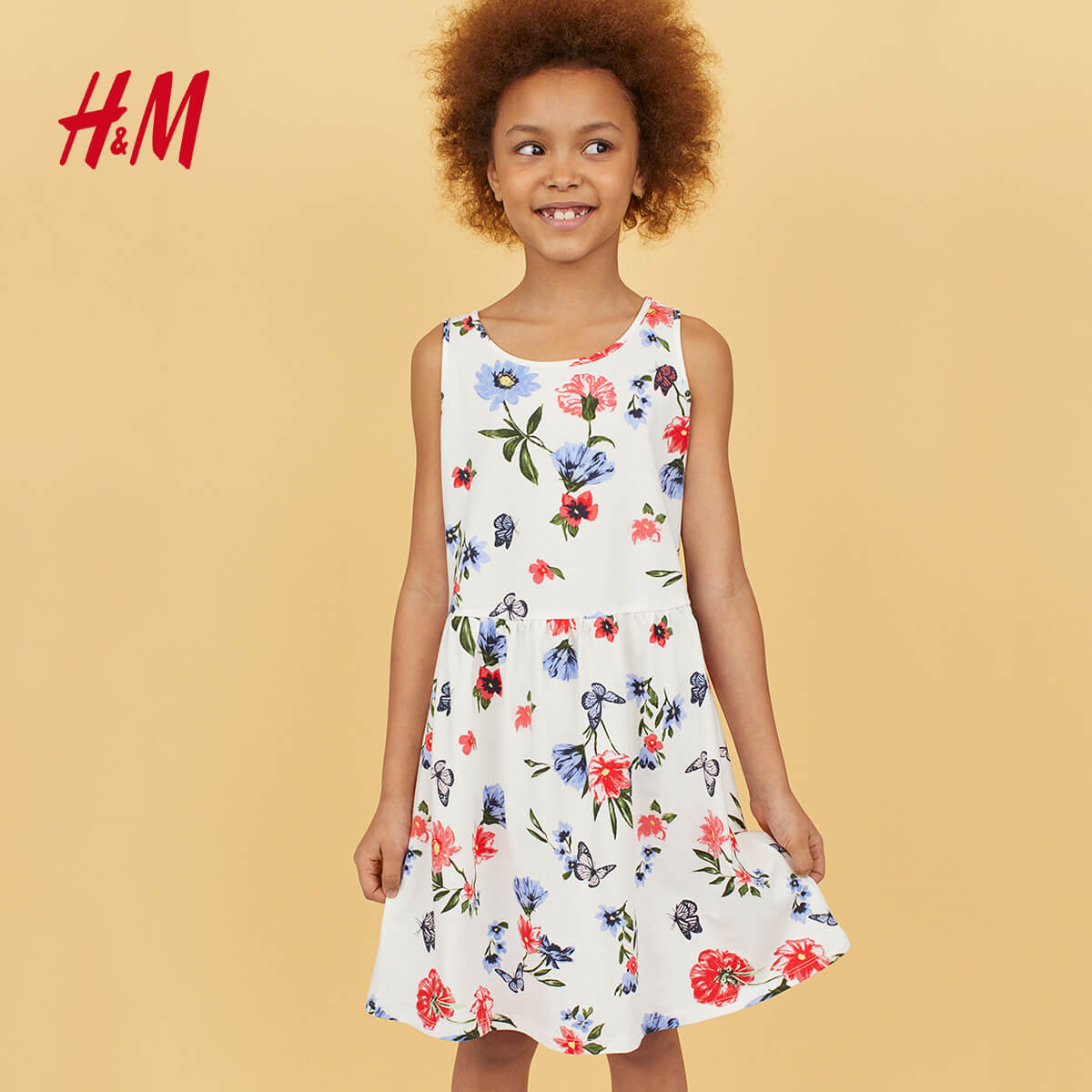 Sleeveless dress in printed cotton jersey with a gathered seam at the waist and flared skirt.