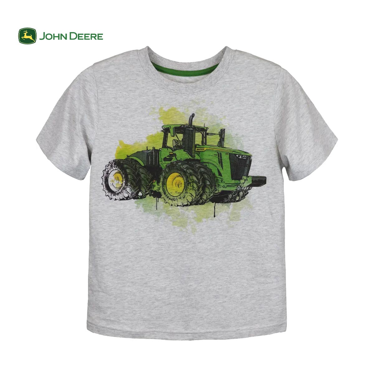 Short sleeve jersey t-shirt with Monster John Deere tractor on a light grey heather body. Contrast color back neck tape. Set in rib neck for ease and comfort.