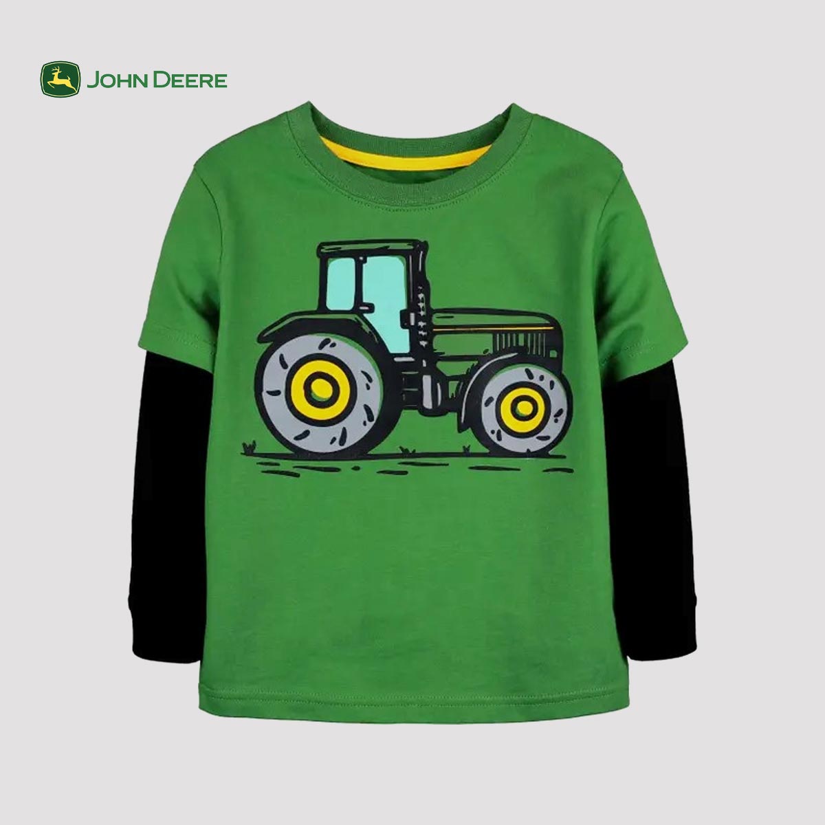 Layered look long sleeve jersey t-shirt with large tractor. Has the look of two tees in one. Constrast color sleeves and cuffs. Set-in rib neck and cuffs for ease and comfort. Features 100% Cotton Jersey