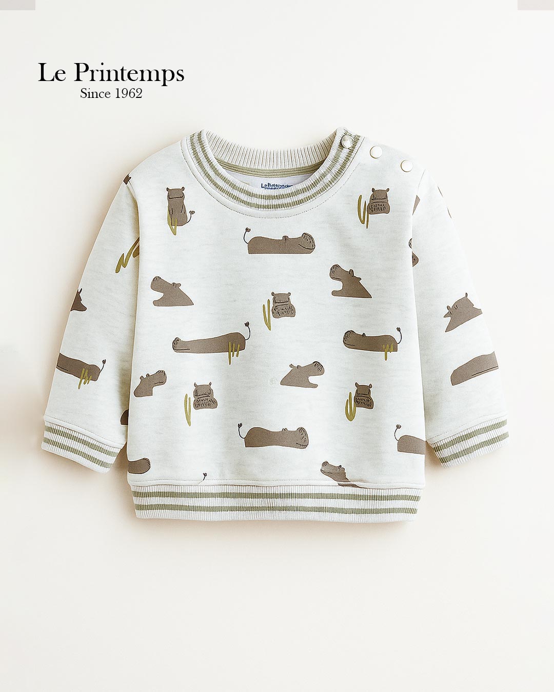 This adorable safari-themed baby sweatshirt features a playful all-over hippo print on a soft, neutral base. Crafted from cozy, breathable fabric, it keeps your little one warm and comfortable throughout the day. The ribbed neckline, cuffs, and hem provide a snug yet gentle fit, while the shoulder snap buttons make dressing and changing quick and hassle-free. Perfect for everyday wear, playtime, or cozy outings in cooler weather.