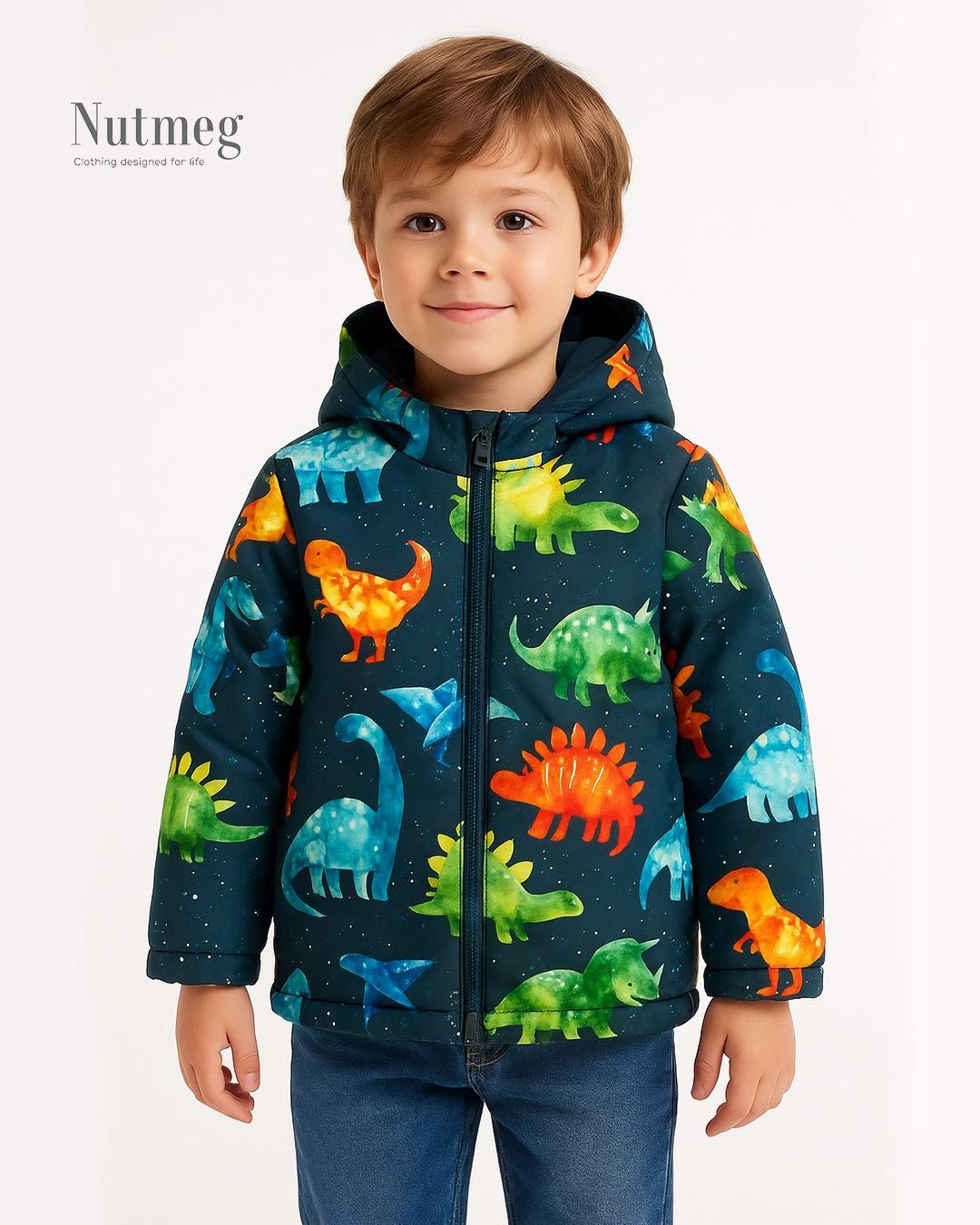 Add a playful touch to your little one’s winter wardrobe with this Nutmeg Dino Print Waterproof Jacket. Designed with a bold, colorful dinosaur print against a deep navy base, this jacket keeps kids both cozy and stylish. The hooded design provides extra protection from chilly winds, while the zip-up front ensures easy wear. Made with waterproof fabric, it’s perfect for rainy days and outdoor adventures.