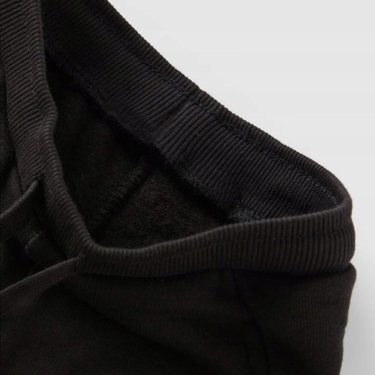 Two-piece cotton suit. Long-sleeved crew neck sweatshirt. Elastic waistband with adjustable drawstring in front and back patch pockets