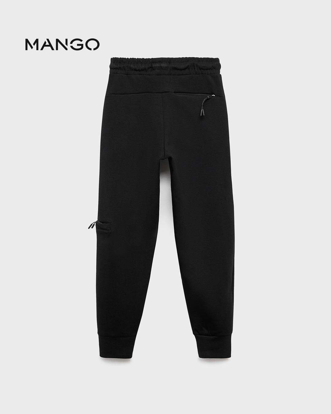 Cotton fabric. Stretch fabric. Long design. Jogger design. Elastic waist with drawstring. Two side pockets. Welt pocket.