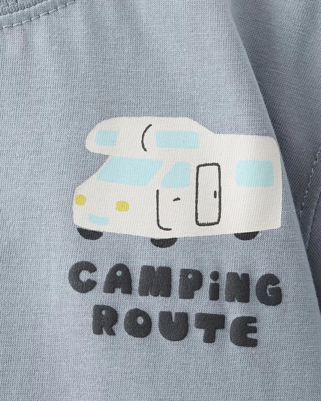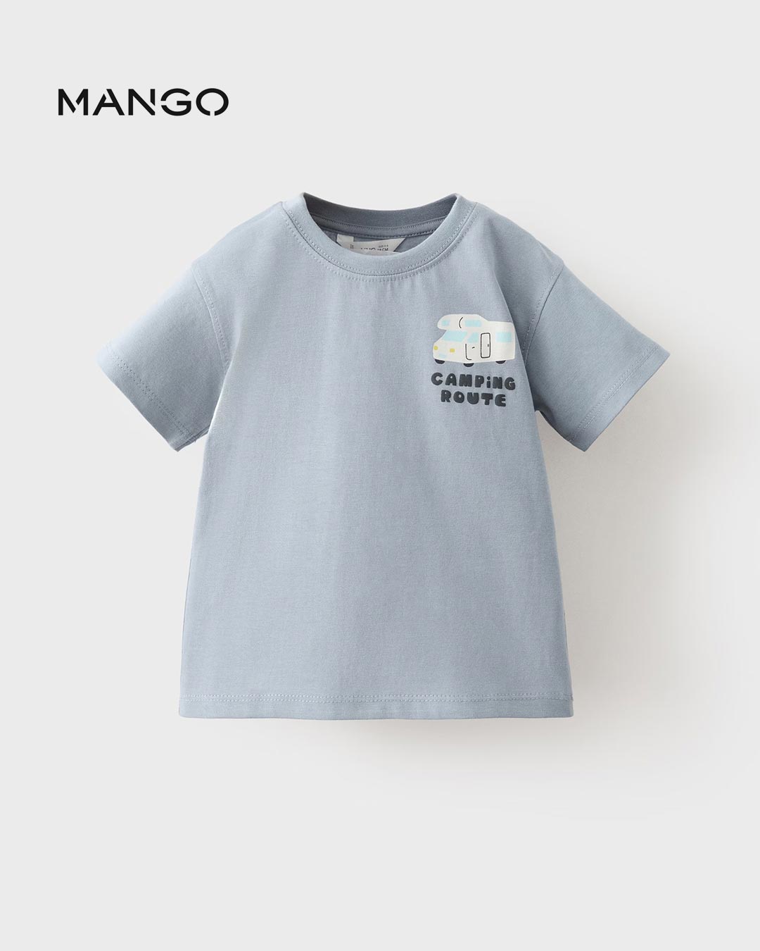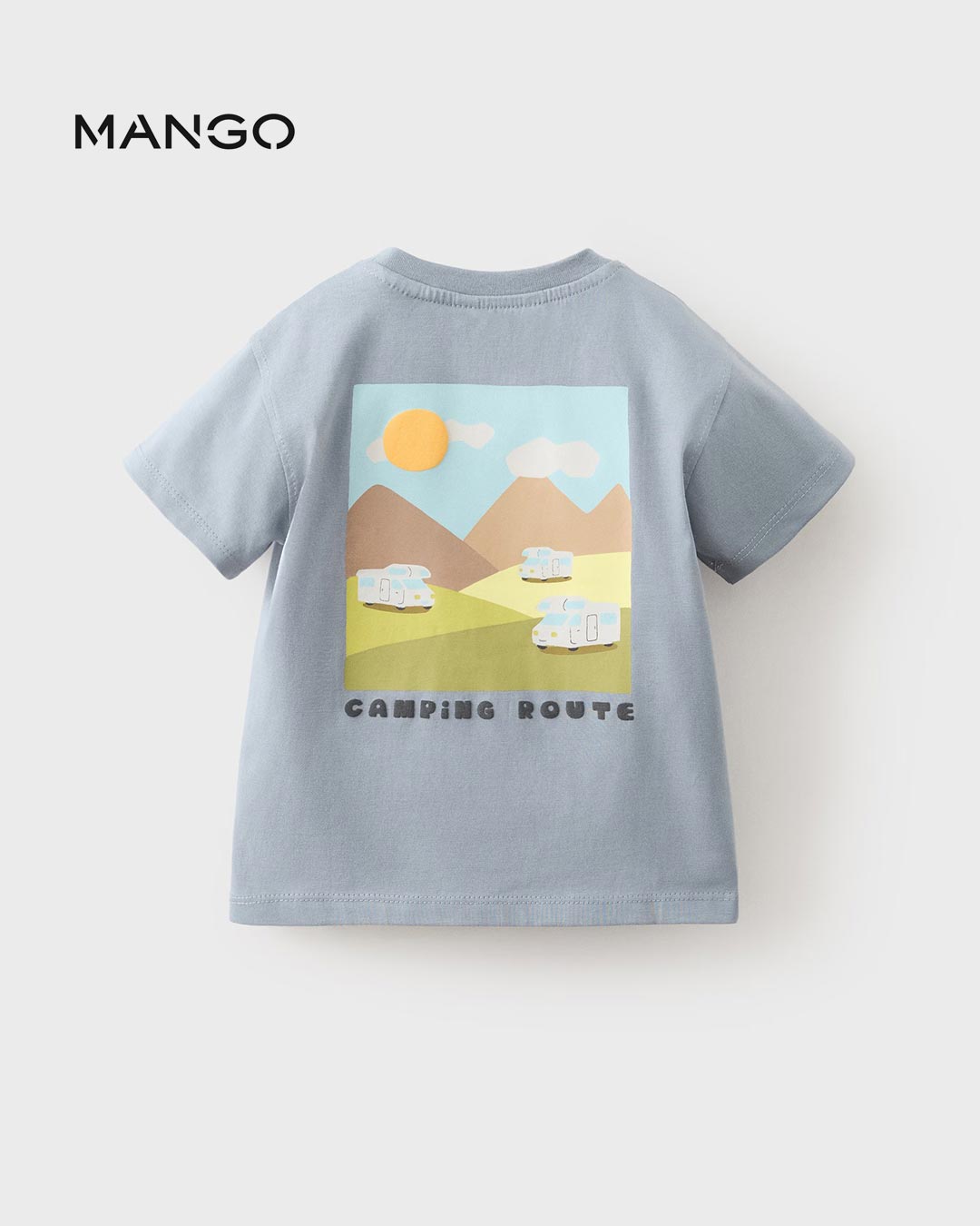 100% cotton fabric. Short design. Printed design. Round neck. Short sleeves. Image printed on the front. Printed drawing of a landscape with mountains on the back.