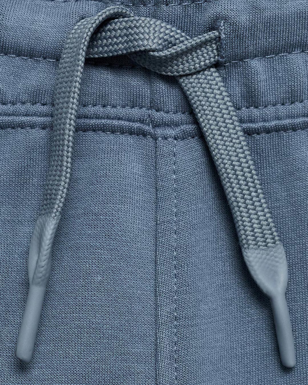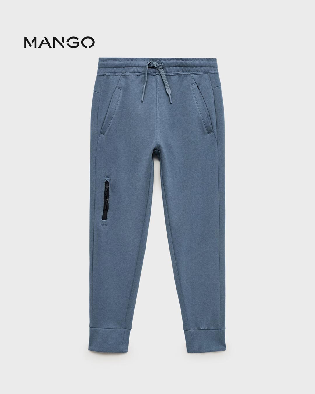 Fabric with cotton. Mid-rise. Elastic waist with drawstring. Two front pockets. Zipped pocket on the front. Zipped pocket on the back.
