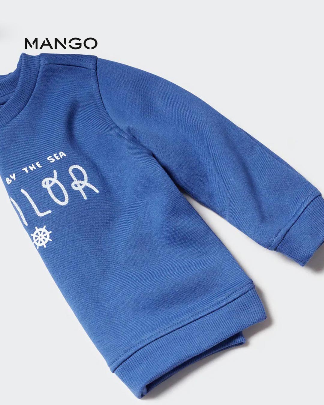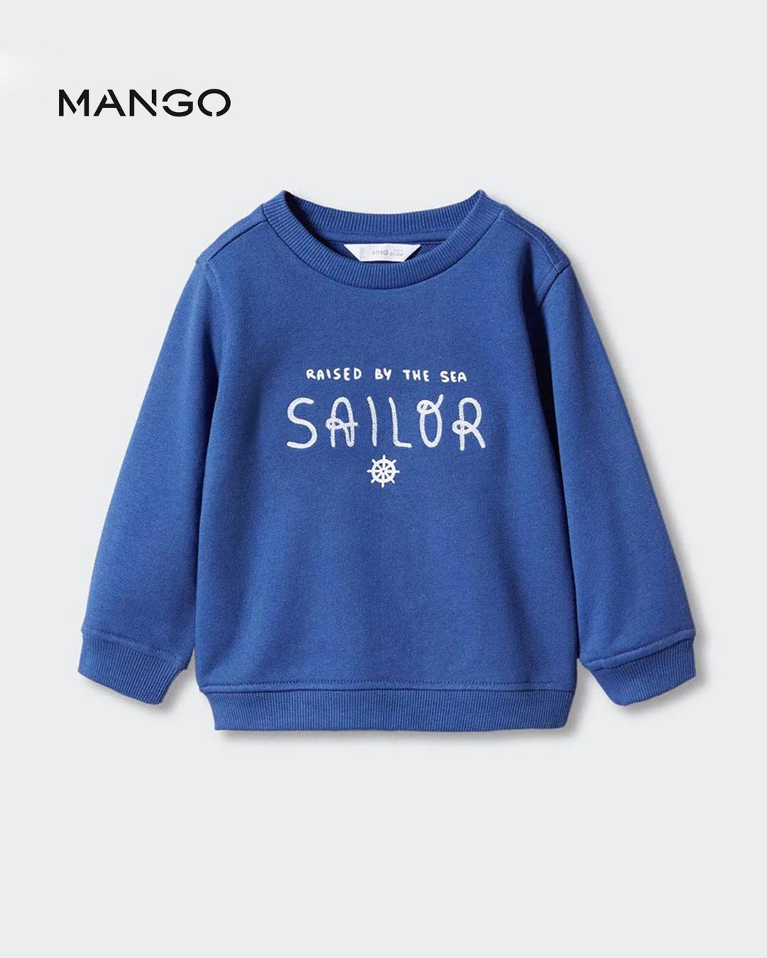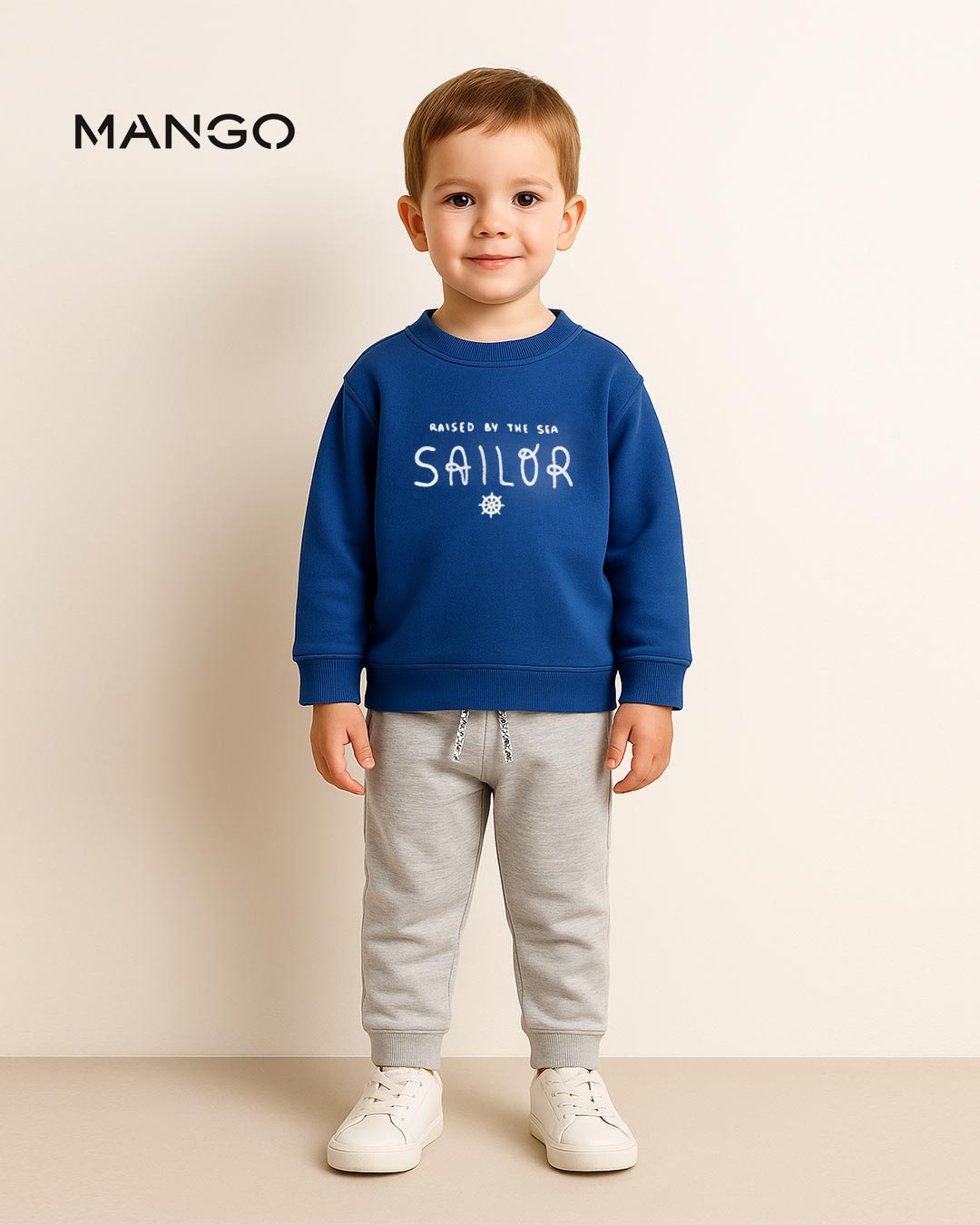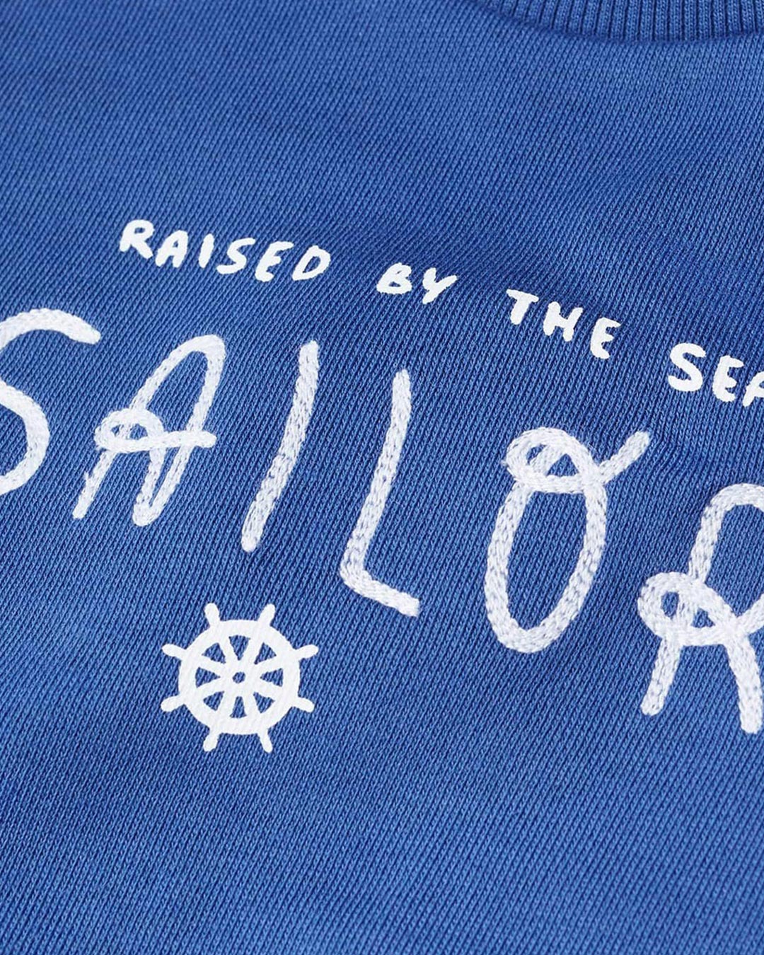 The blue sweatshirt features a playful “RAISED BY THE SEA – SAILOR” graphic in white, giving it a fun nautical theme. Paired with ultra-soft grey joggers featuring a comfortable elastic waist and drawstring, this outfit ensures maximum movement and all-day comfort.