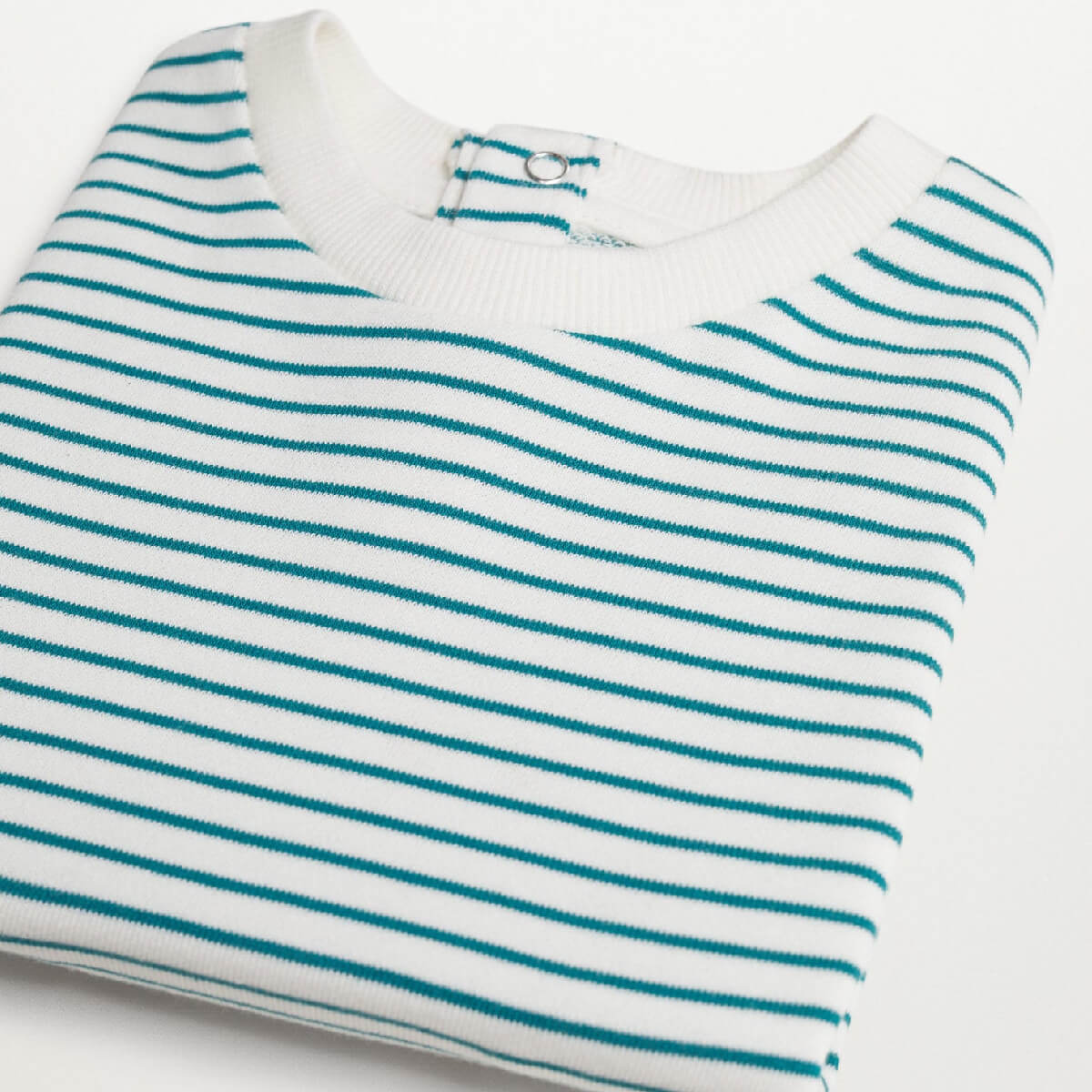 DESCRIPTION 100% cotton fabric. Striped print. Rounded neck. Long sleeve. Dropped shoulder seams. Cable knit finish. Press stud fastening on the back.”