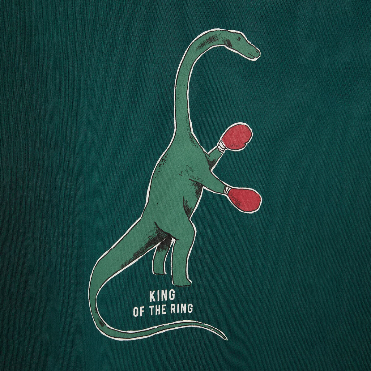 DESCRIPTION Organic cotton fabric. Dinosaur print. Printed message. Rounded neck. Long sleeve. Dropped shoulder seams. Elastic ribbed endings.