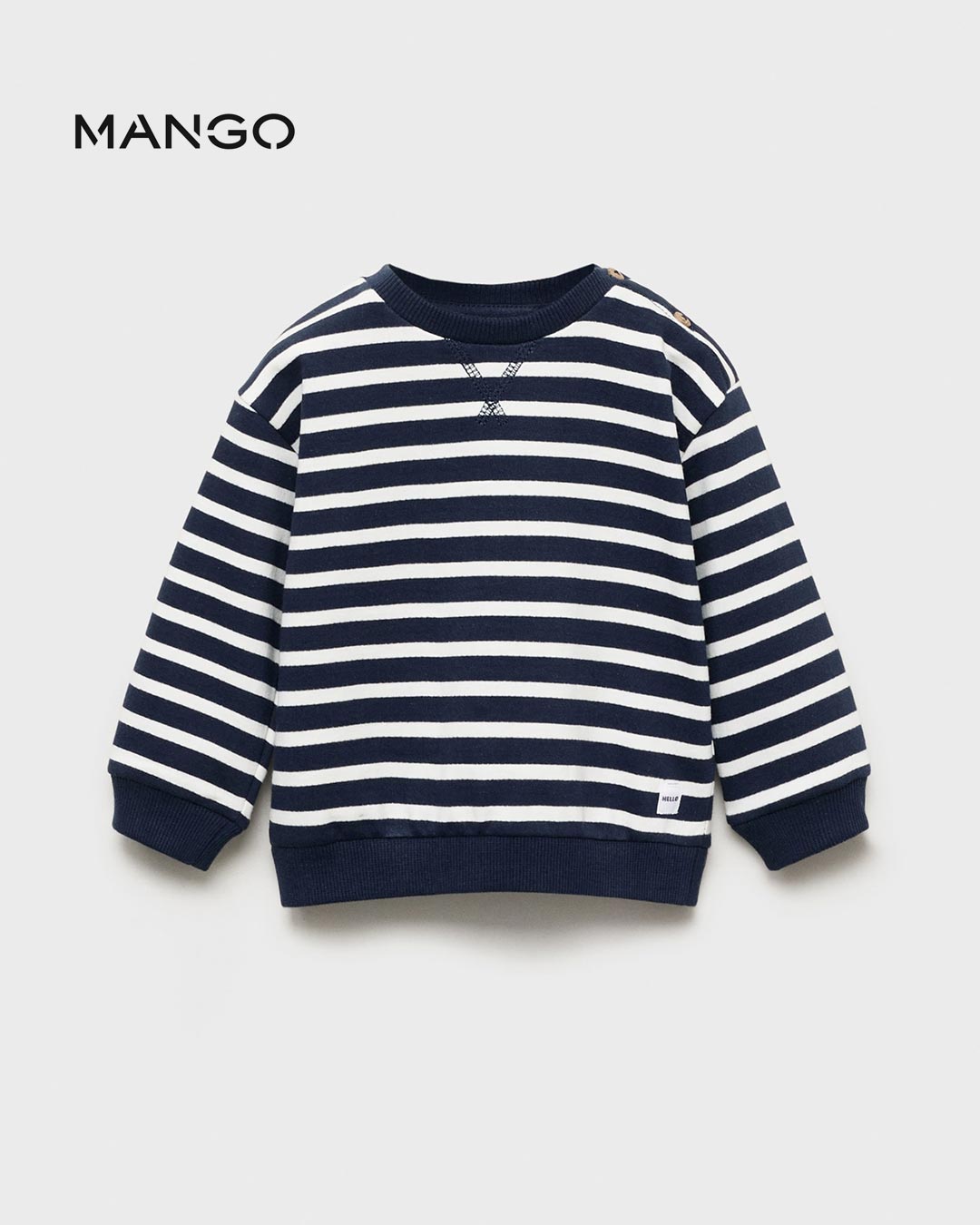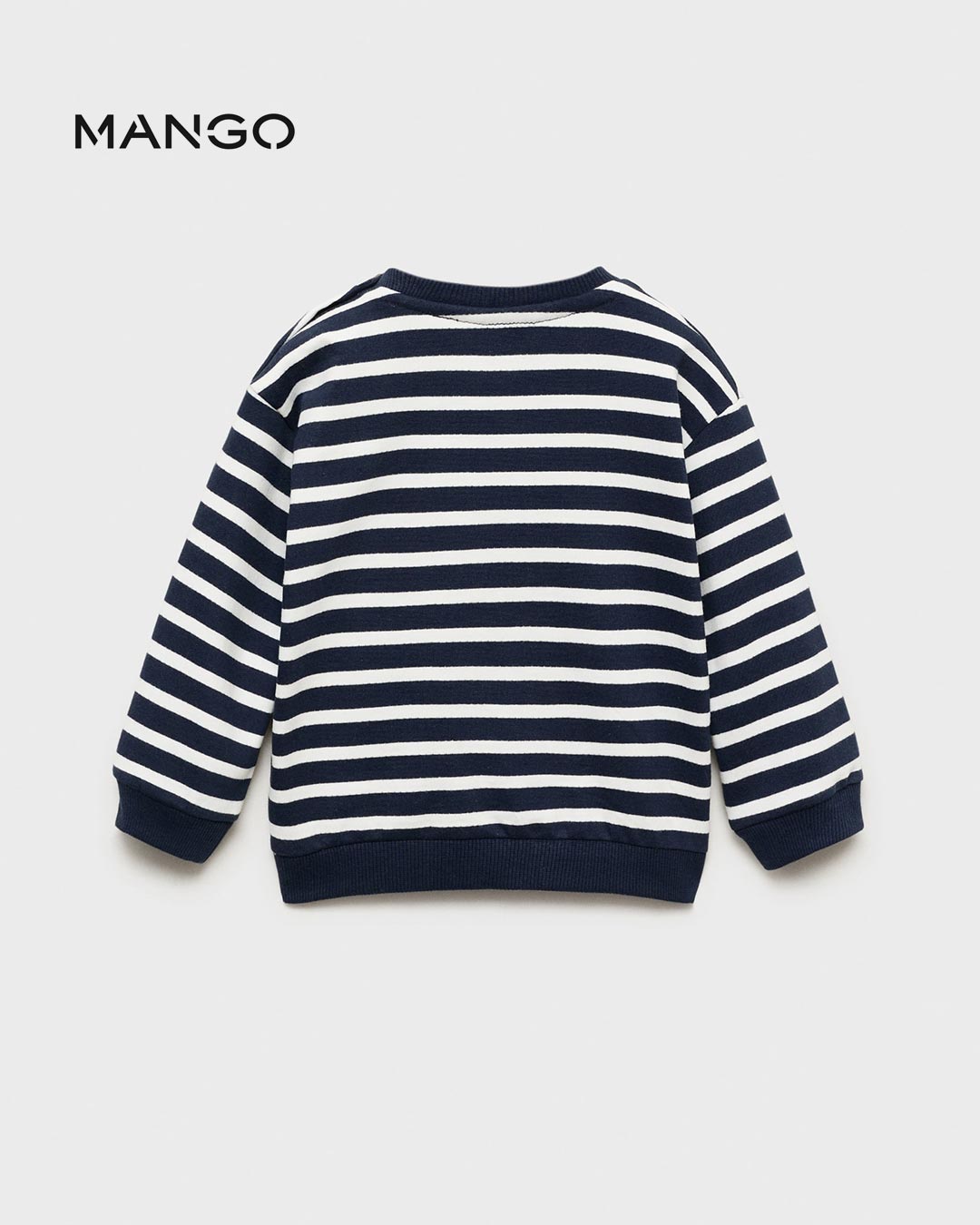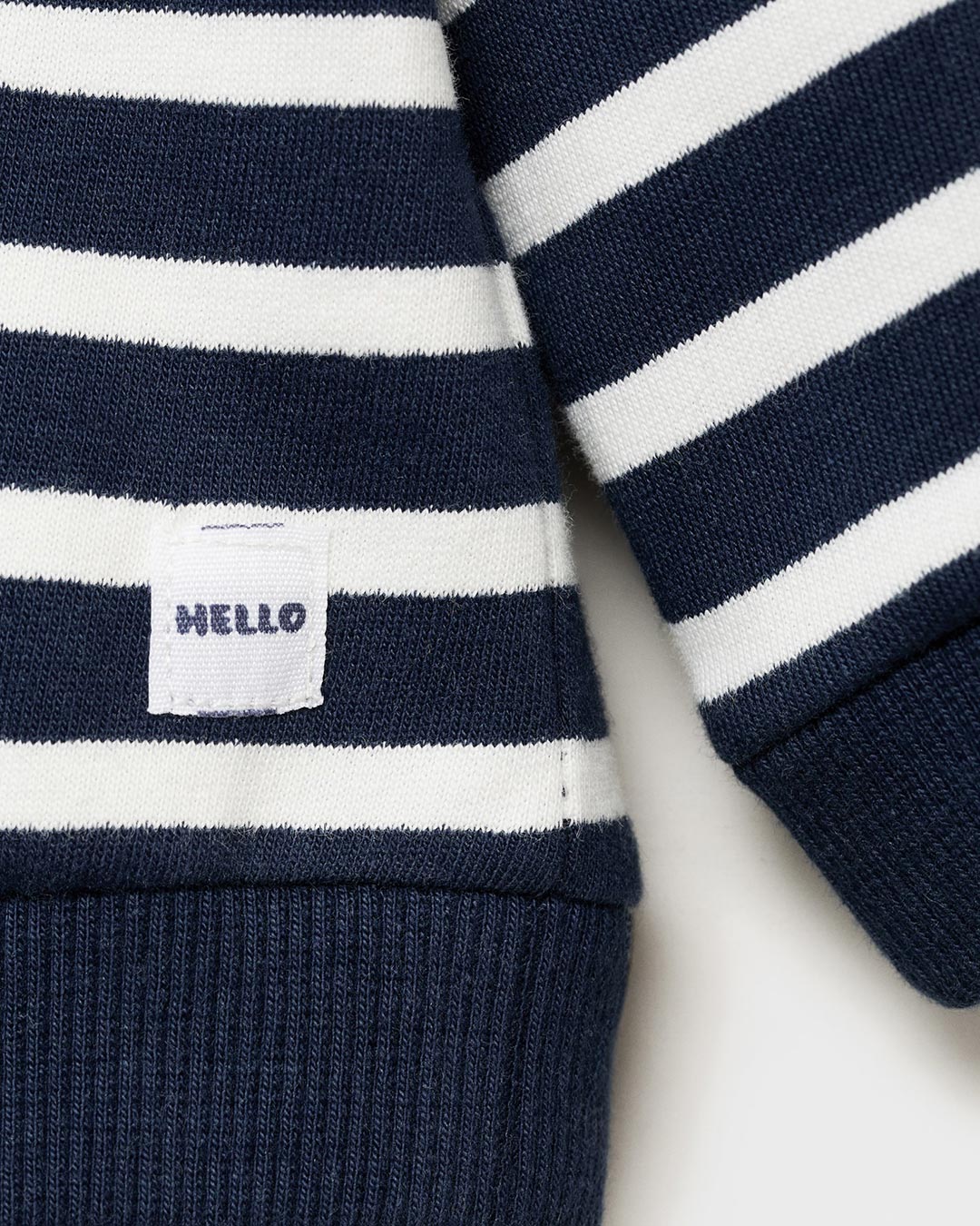 100% cotton fabric. Straight design. Stripe design. Round neck. Long sleeve. Ribbed collar, cuffs and hem. Decorative patch.