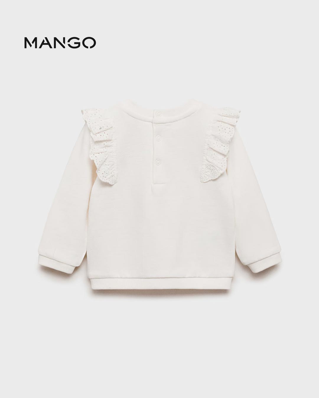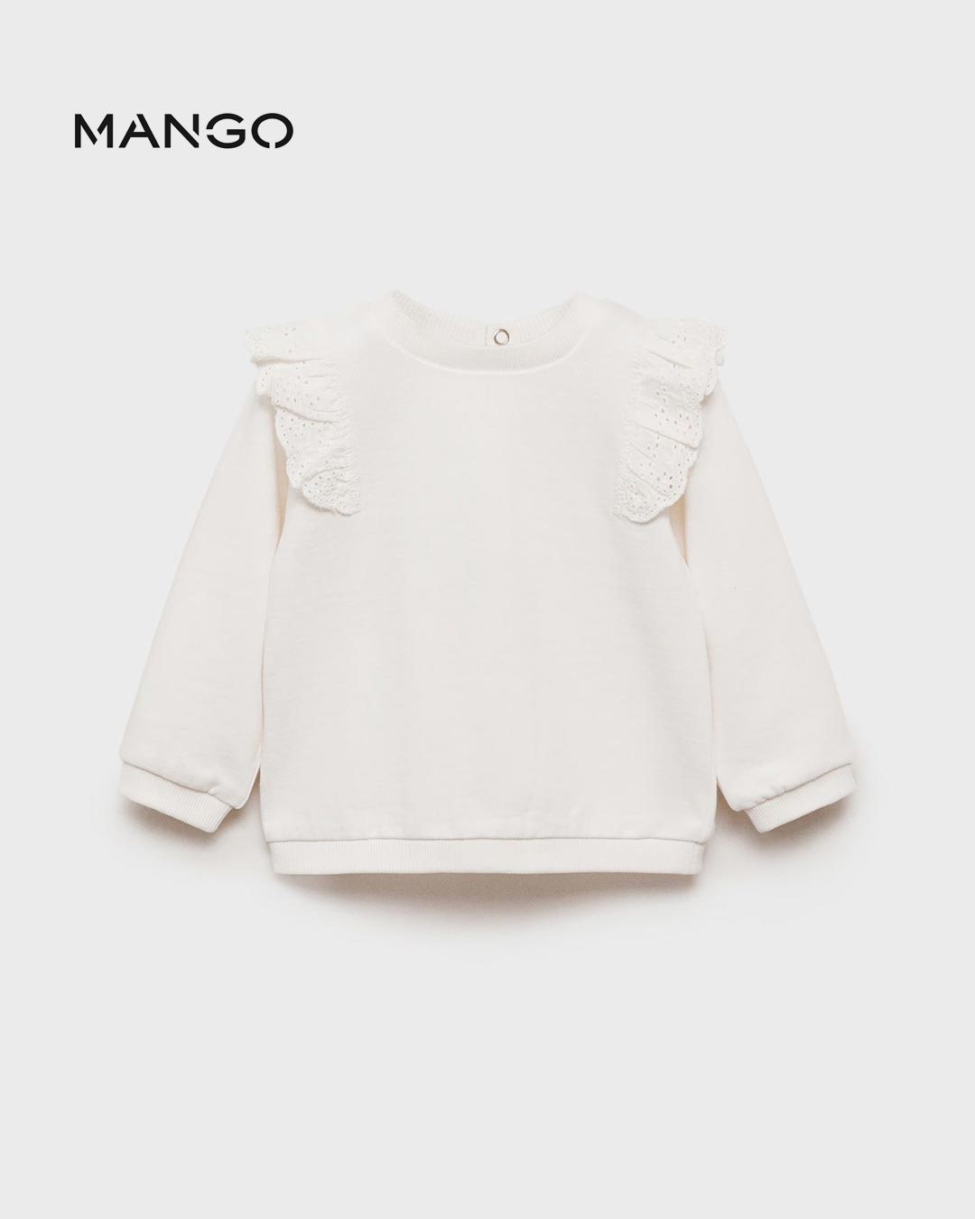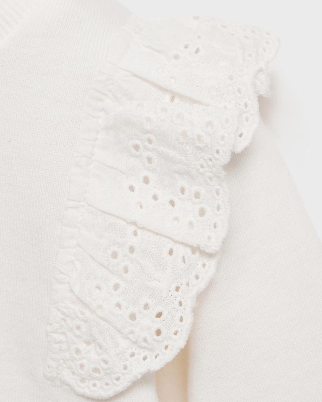 100% Cotton. Straight design. Swiss embroidered ruffle. Ribbed collar, cuffs and hem. Round neck. Neck closure.