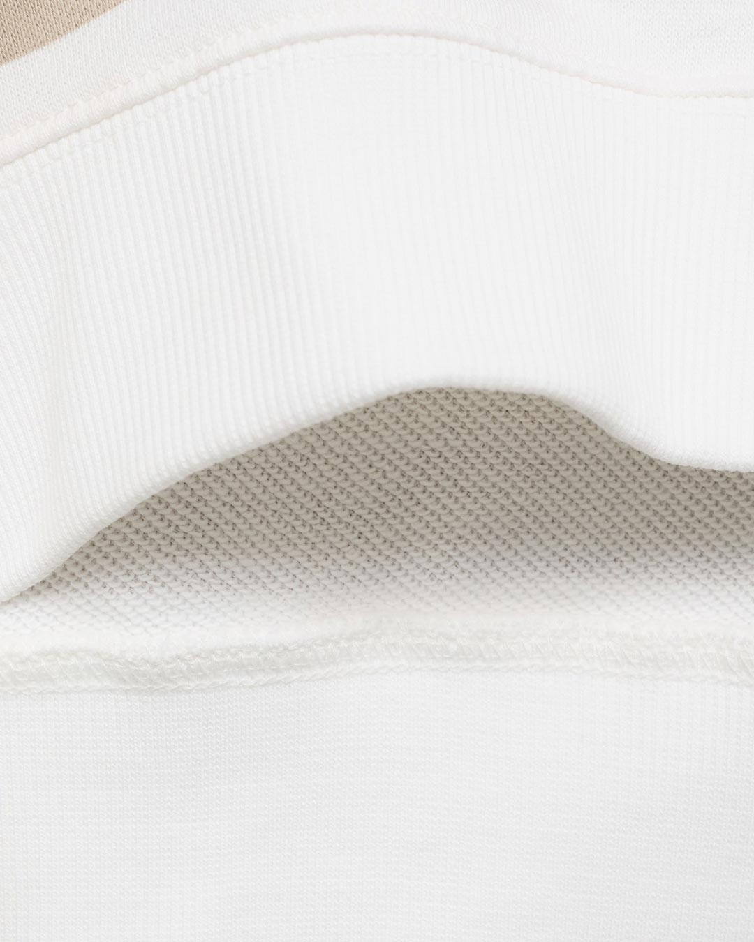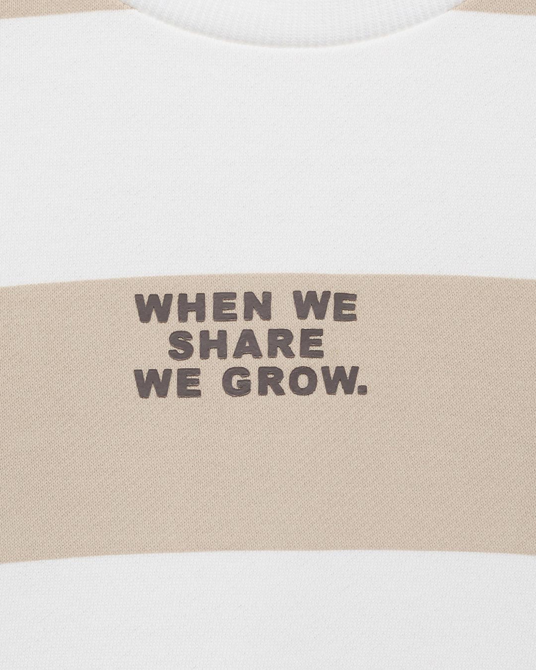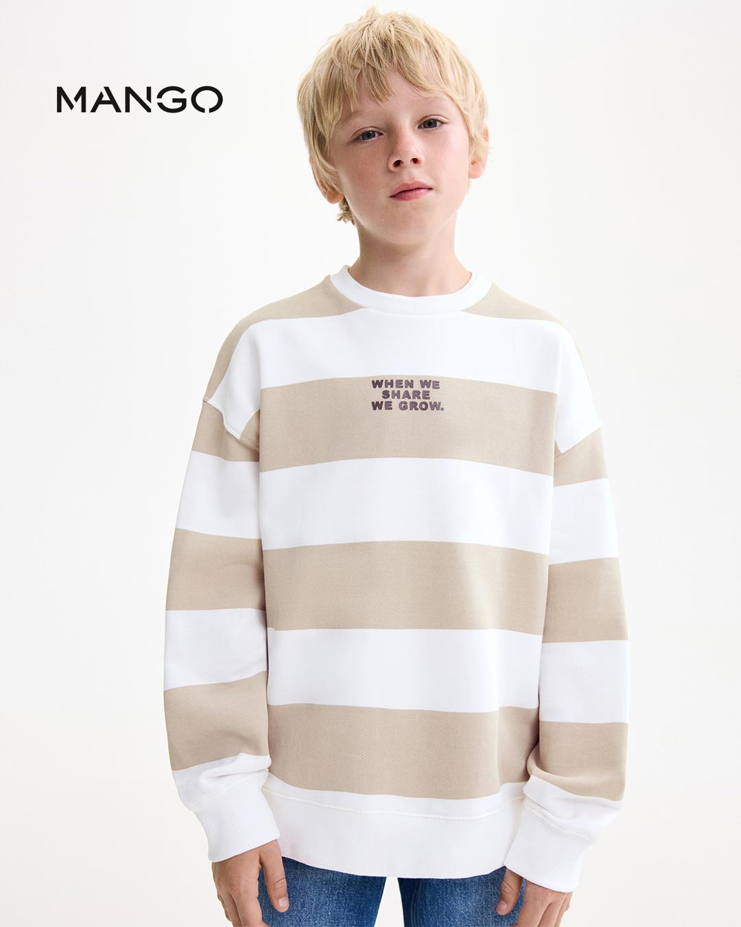 100% cotton fabric. Striped fabric. Straight design. Round neck without hood. Long sleeve. Ribbed collar, cuffs and hem. Printed text on the front.