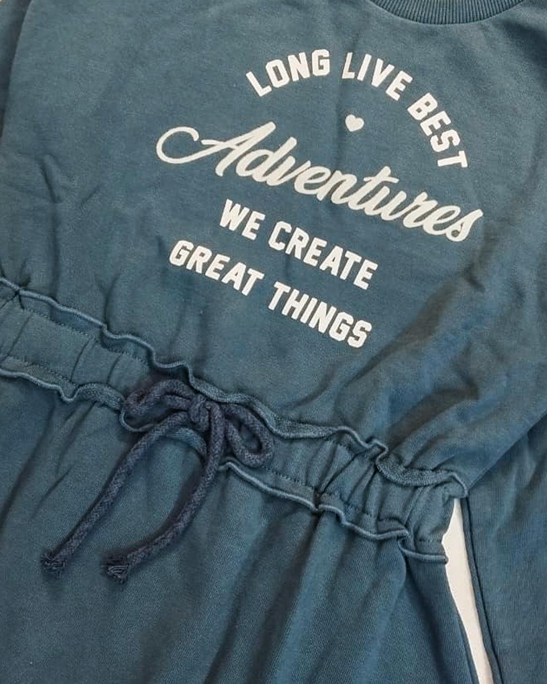 This Girls Teal Blue Sweatshirt Dress blends cozy comfort with a stylish, everyday look. Designed in a soft sweatshirt fabric, it features a motivational front print that reads “Long Live Best Adventures – We Create Great Things”, adding a playful and positive vibe to her outfit.