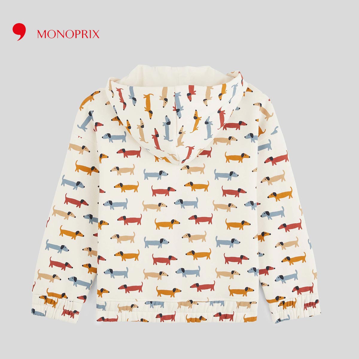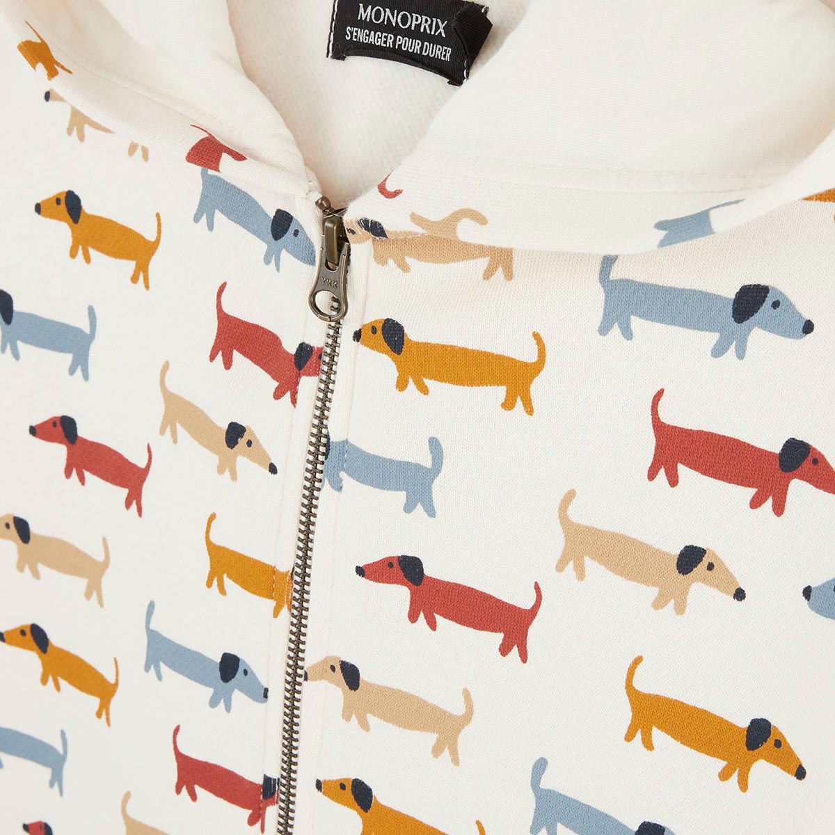 Zipped sweatshirt with dog print, GOTS certified Printed hood Zipped closure Two front pockets Elasticated sleeve and bottom hem GOTS: This product is made from organic cotton certified by the main standard in this field, the Global Organic Textile Standard. Grown without GMOs, pesticides or toxic phytosanitary products, organic cotton cultivation requires less water than conventional cotton. OEKO-TEX: international label that guarantees the absence of substances harmful to health and skin. Model number: T31660247