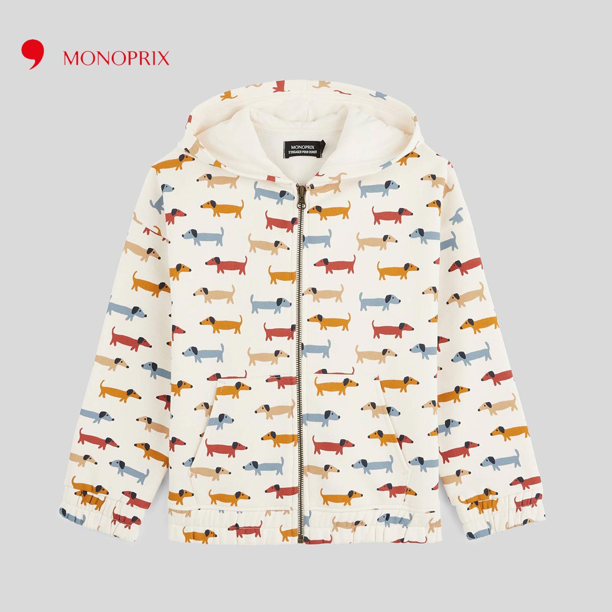 MONOPRIX BEIGE PRINTED ZIPPED SWEATSHIRT WITH HOOD